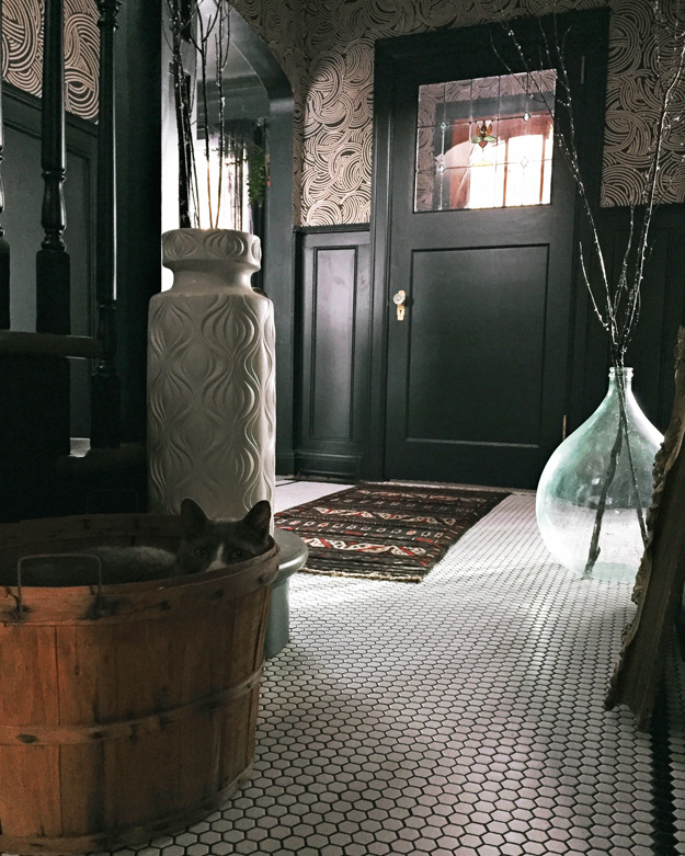 Yesterday I placed a vintage apple basket in the foyer to stash hats/mitts/scarves for winter and within 5 minutes it was taken over…