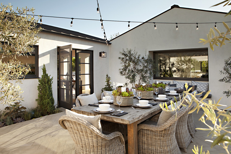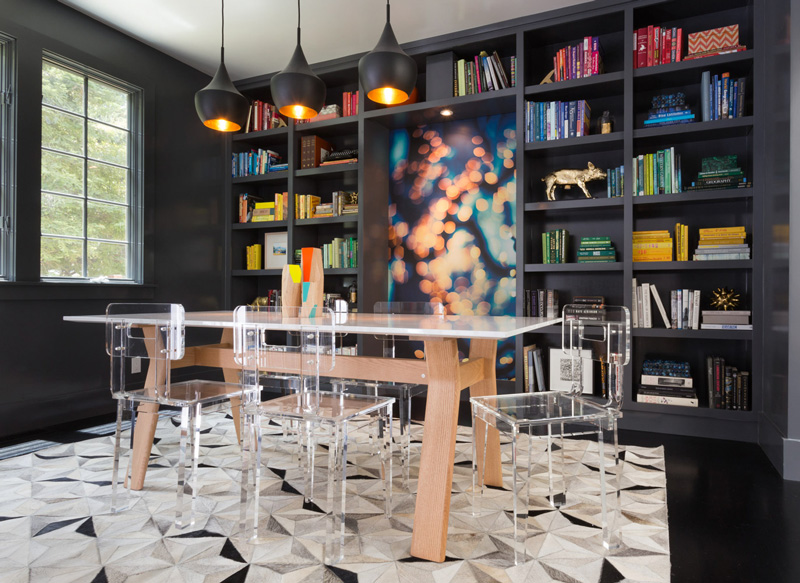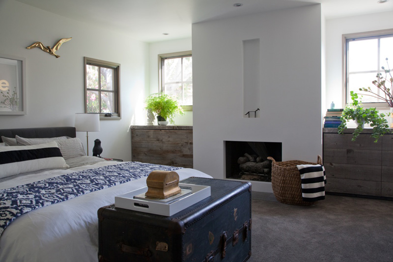 I love everything about this California house designed by architect/designer Eric Olsen. There’s the understated dark exterior, the semi-dark-painted kitchen with awesome upper display shelving, the wood stack in the dining room and modern mismatched chairs, the creative paint job in the bedroom, the tile in the bathrooms and the backyard oasis. Dreamy!!!