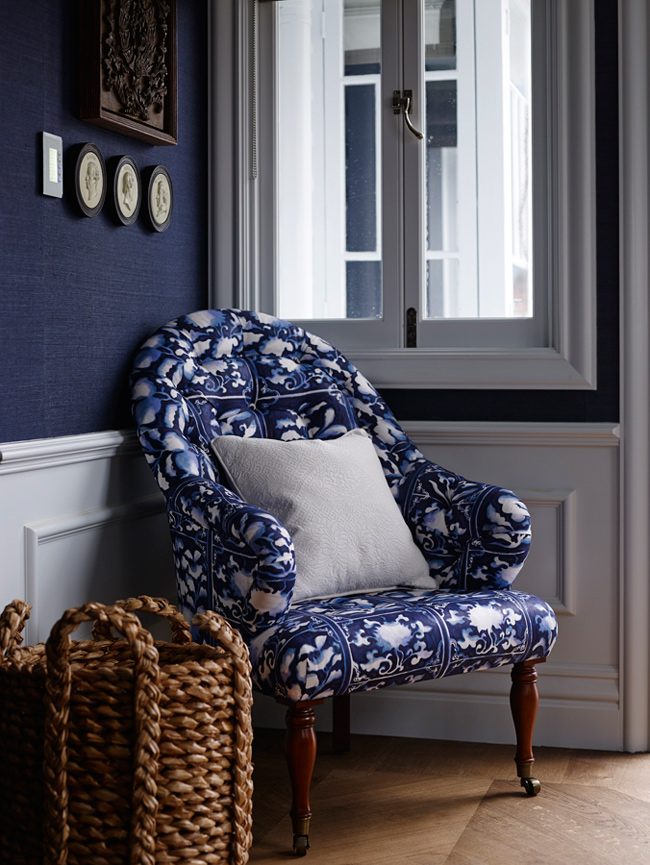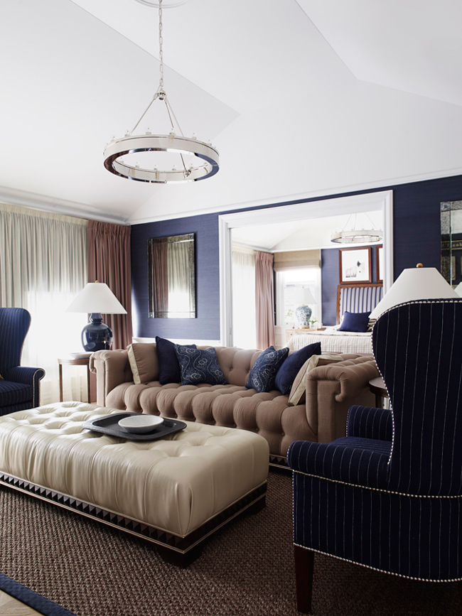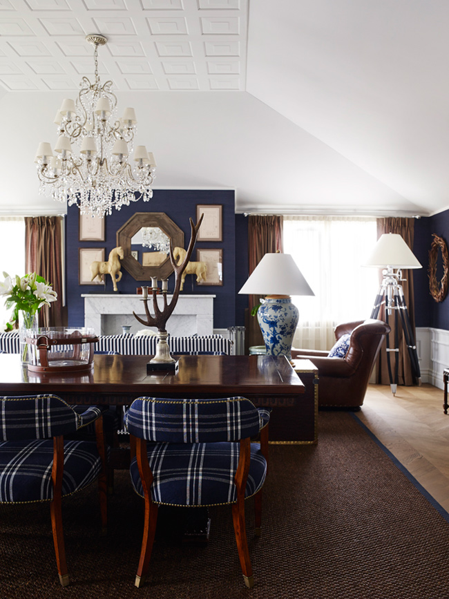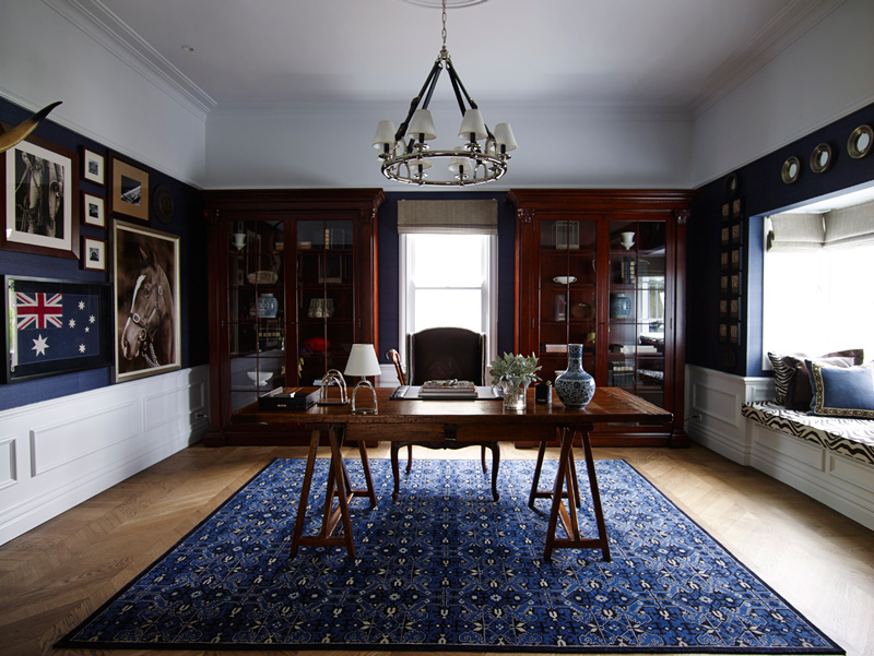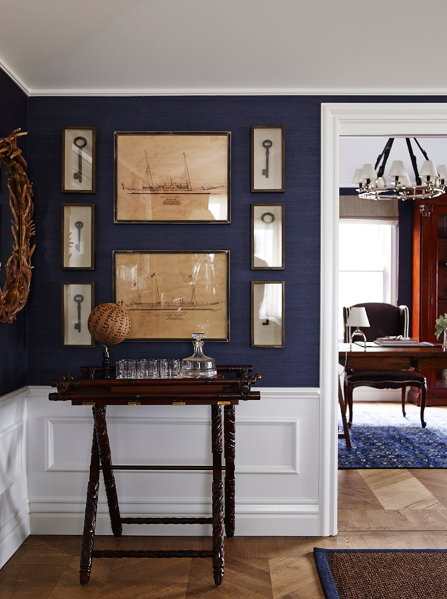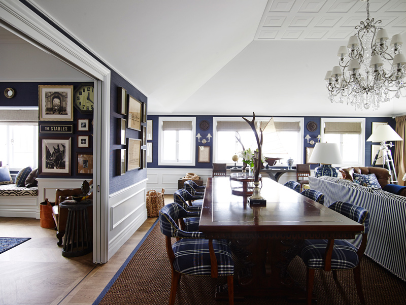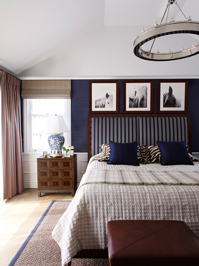 I stumbled upon a project by Australian interior designer Greg Natale that we appear to have never featured before, which is crazy since we have been obsessed with his work since for the past 10 years (or more If Jo knew him before we started this blog). Maybe it’s because we typically die over his typical glamourous, Hollywood Regency projects…and this one is far from that but I’m kind of dying over it just the same. Only Greg could make nautical/New England style this freaking fabulous. I want to be a guest in this guest house – and move right in! From its navy plaids and stripes to its walnut-hued timbers and leathers, this Queenslander has been furnished in classic New England style to create the effect of a lavish country estate. Themed accessories and artworks, such as equine photos and sculptures, and grouped accoutrements, like a series of armorial engravings, contribute to the full, layered feel, while pieces blend Western styling with Eastern exoticism. A band of navy grasscloth wallpaper runs through the house, providing an eye-catching decorative feature but also linking rooms that have been differently configured as a result of the angled roofs.