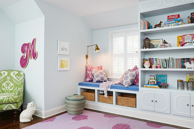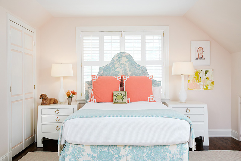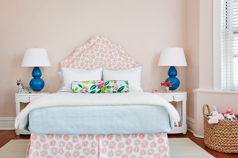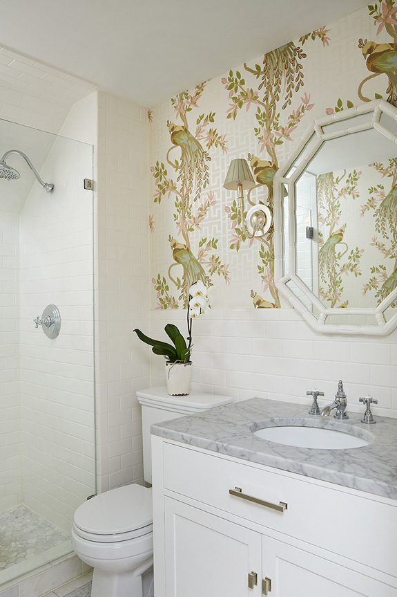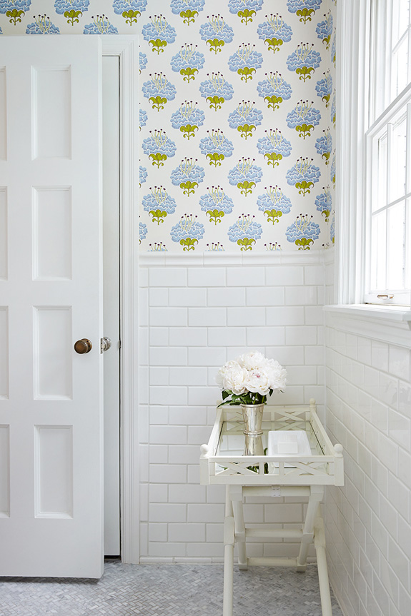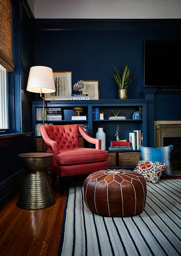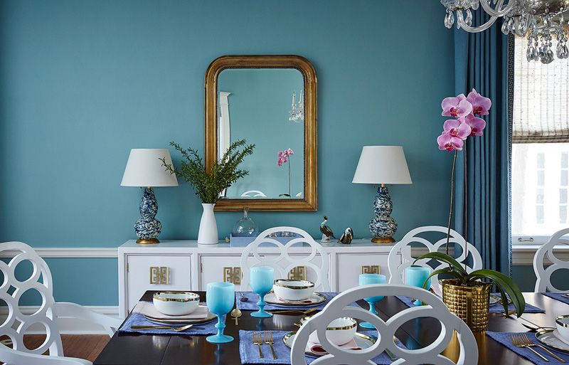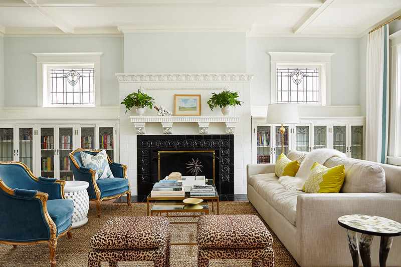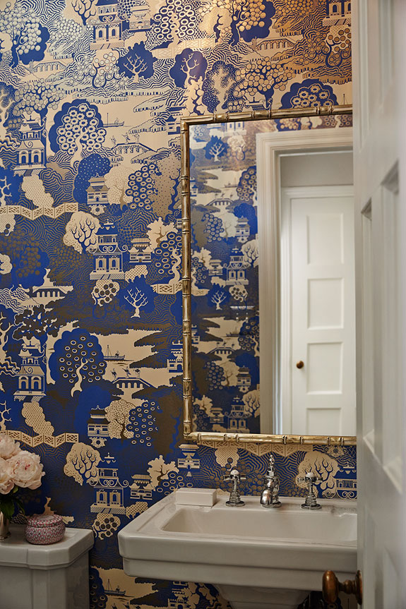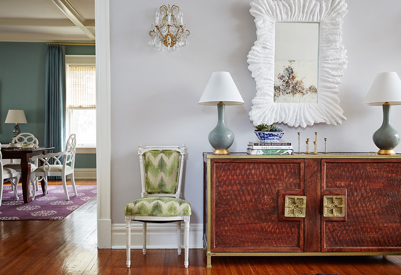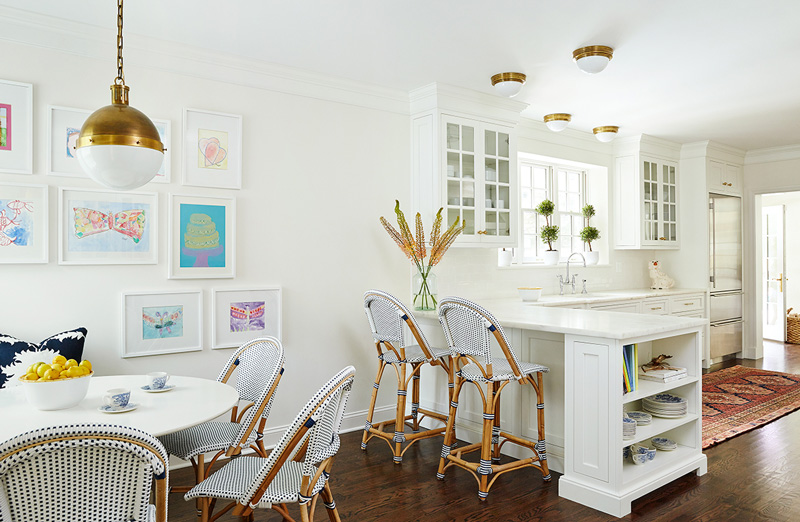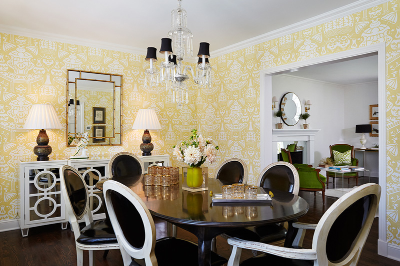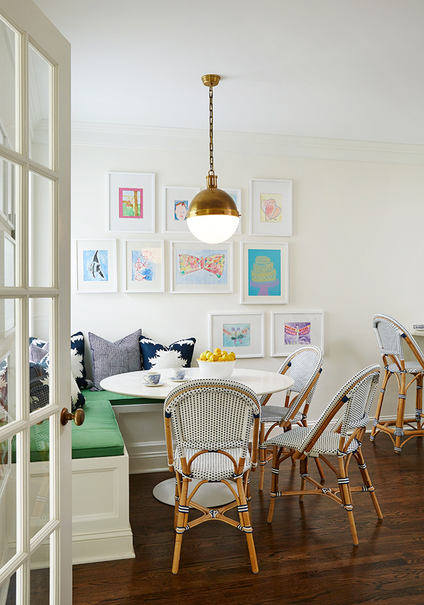 Interior designer Amie Corley of St. Louis, MO is all about creating drama with colour and pattern. Sometimes this can be overwhelming but she certainly knows how to show restraint and keep her designs classy and polished. And bonus points for the use of Farrow & Ball’s Tessella wallpaper in the informal dining area which is fabulous with the wicker bistro chairs.