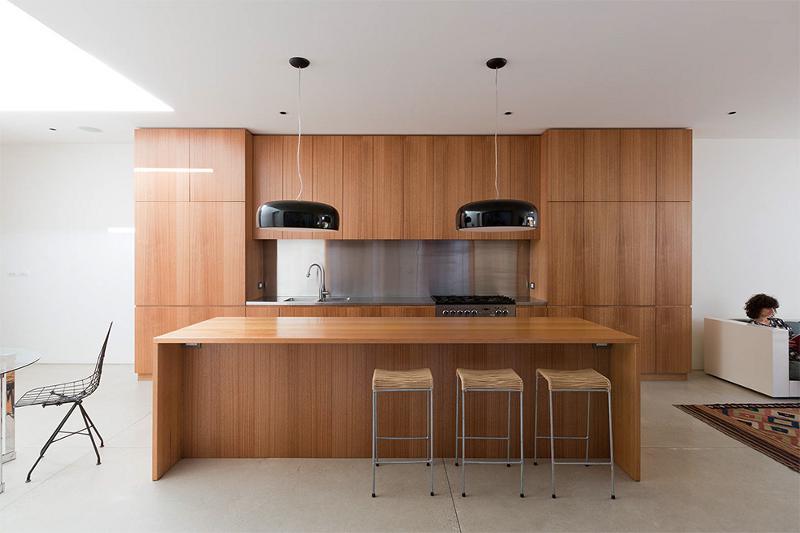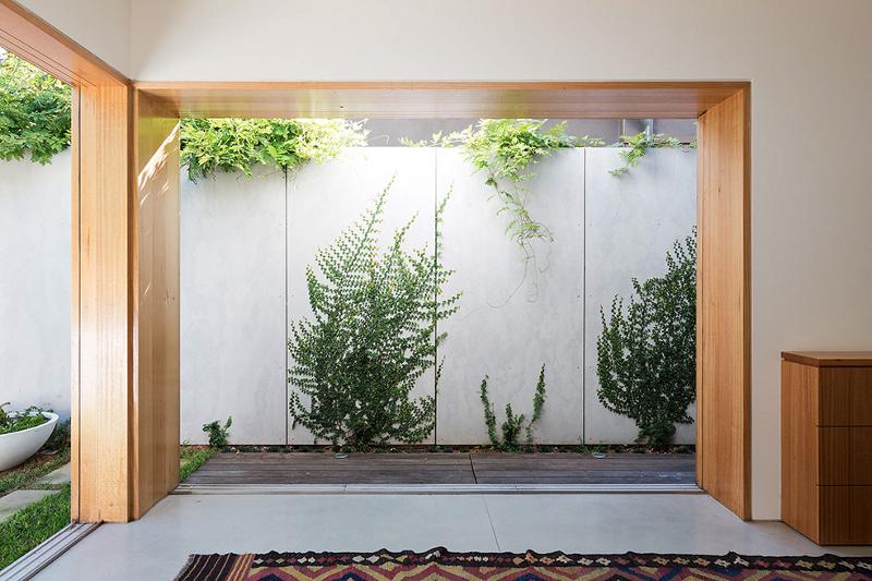 Deep timber reveals frame the view through sliding doors in this Sydney terrace house extension. White is warmed by timber while walls of growing green will eventually soften external views. Light wells delineate space within the open plan and clean, minimal lines allow the narrow space to appear so much bigger. The Bondi House by Fearns Studio.