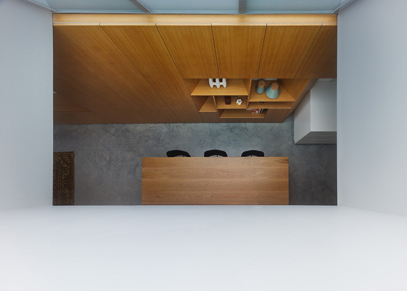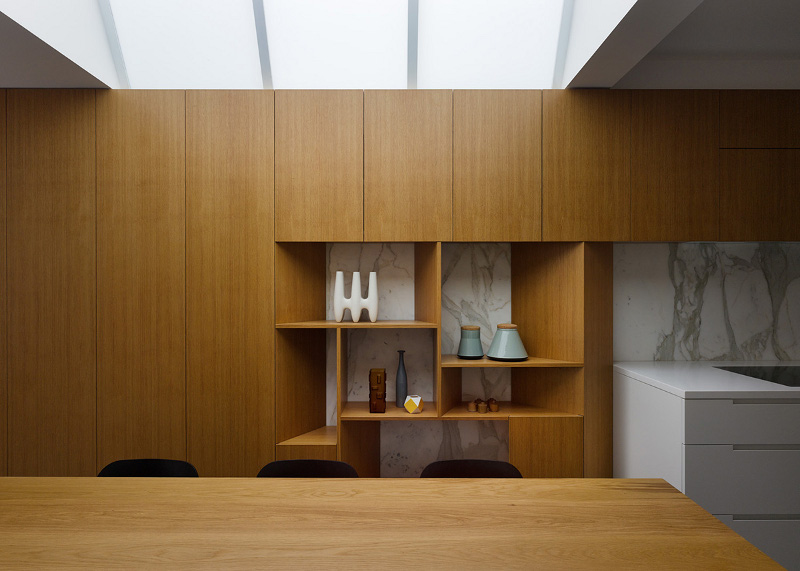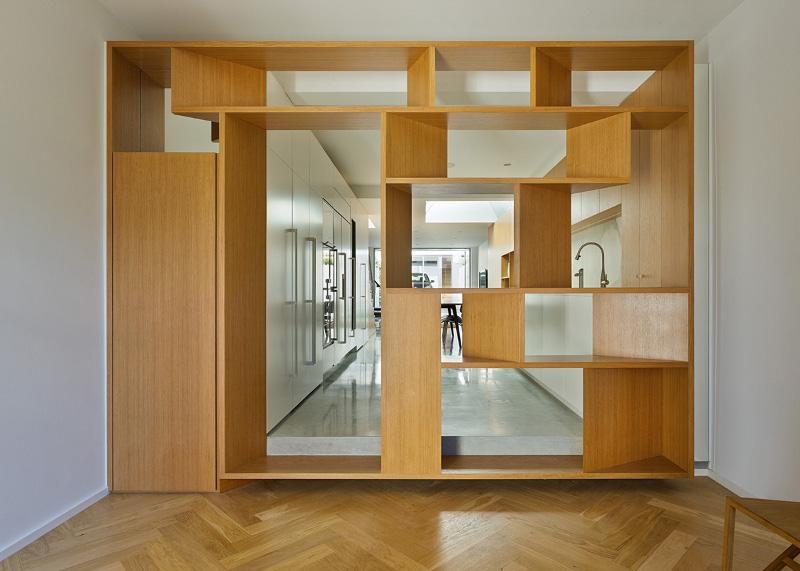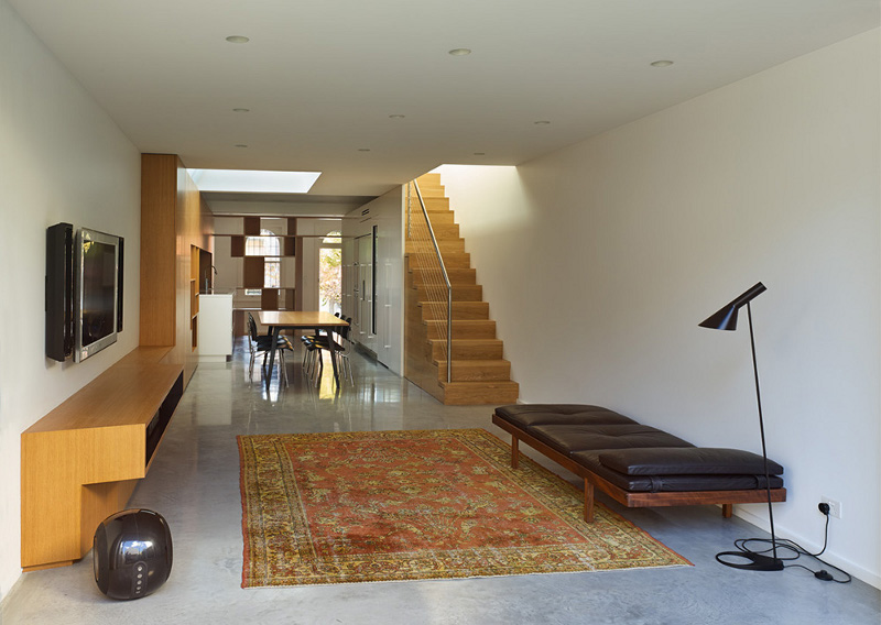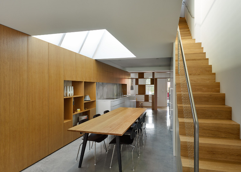 Timber joinery like a spine down the back of a gut renovation of this Paddington, Sydney terrace house. Providing storage and screening, room definition and warm wooden tones to the stark white shell. Design by Bennett and Trimble. Photography by Peter Bennetts.