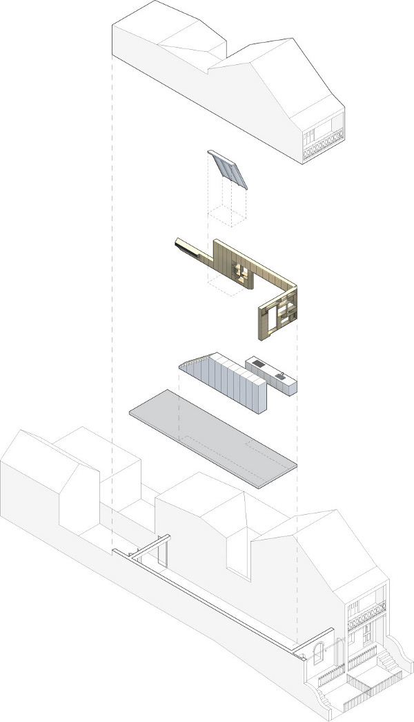 “Foam Street House features the adaptive reuse and transformation of a cold, dark and inefficient 1915 Edwardian house into a warm and light filled family home that has direct connections to the outside.”