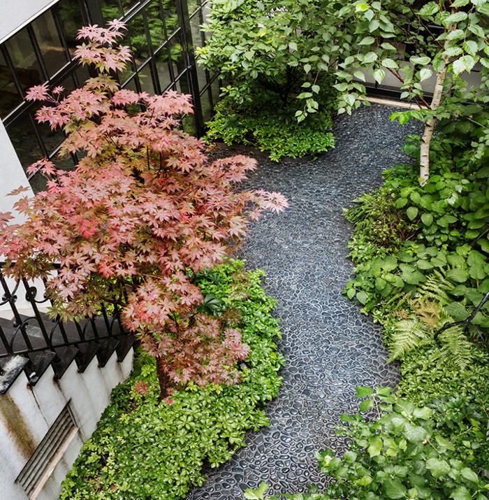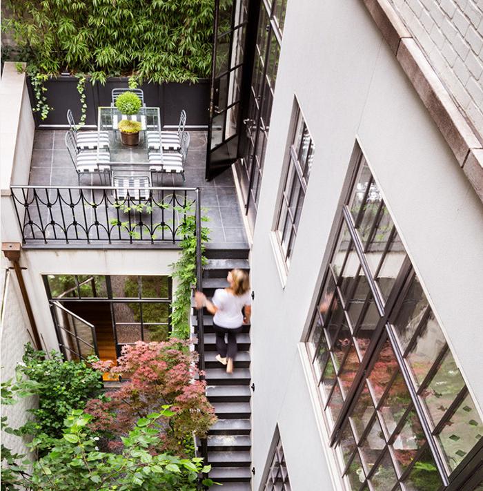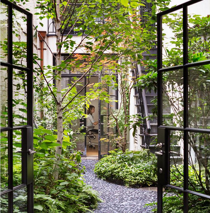 Sigh. Wouldn’t it be perfect. Tied to a computer terminal but just steps away from this lovely courtyard. From a townhouse in the upper east side by Rees Roberts.