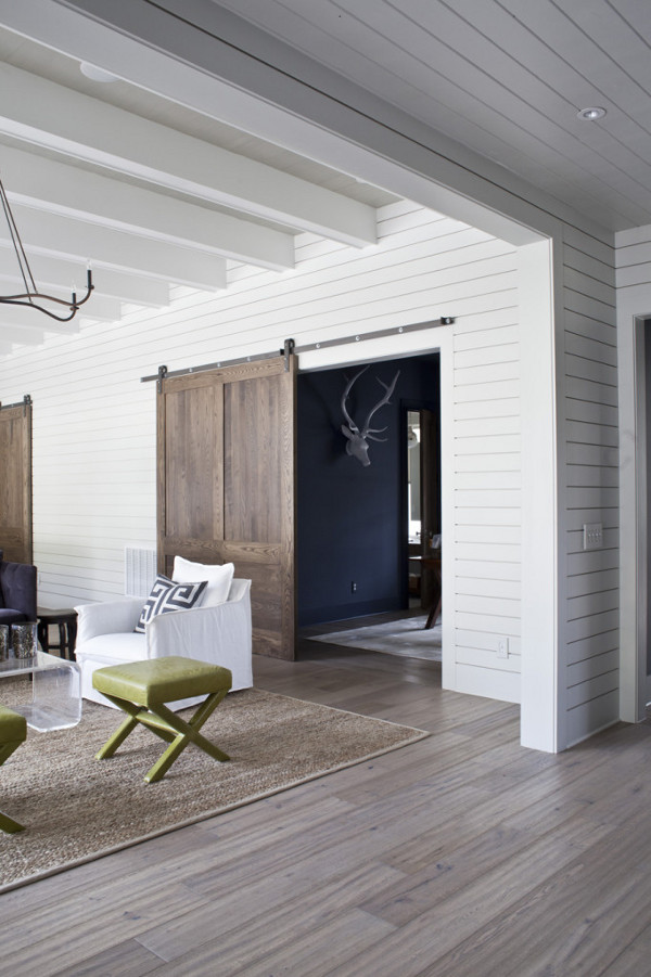 A simple French apartment that may be small in size but big in style. Ideas to steal? The whitewashed old door track mounted to save space, the red cords on the island lights and a bookcase that makes a statement in an otherwise calm space. By interior designer Muriel Cibot. Très bon.