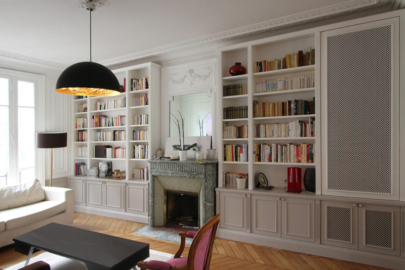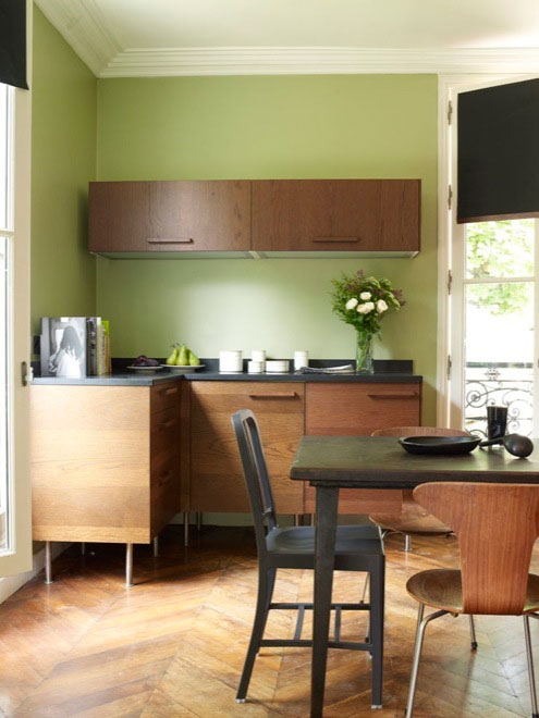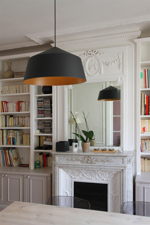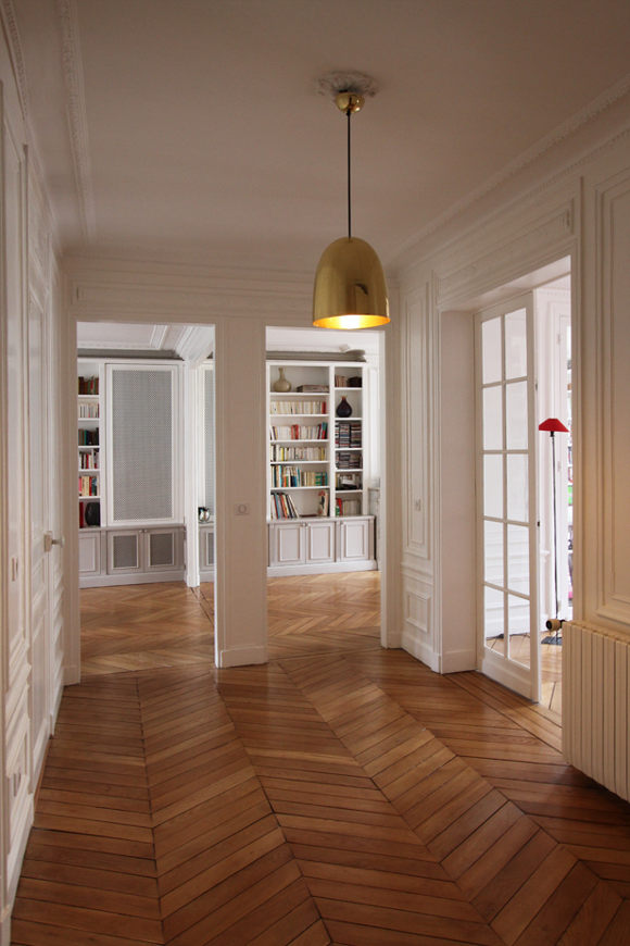 A sweet little piece of Parisian architectural candy. Ornate touches to the ceilings, old wooden floors and scrolly iron work on the balcony. Beautiful bones juxtaposed with midcentury and modern. Then bam! Colourful riot on the wall. A little pastille of perfection by Camille Hermand Architectures.