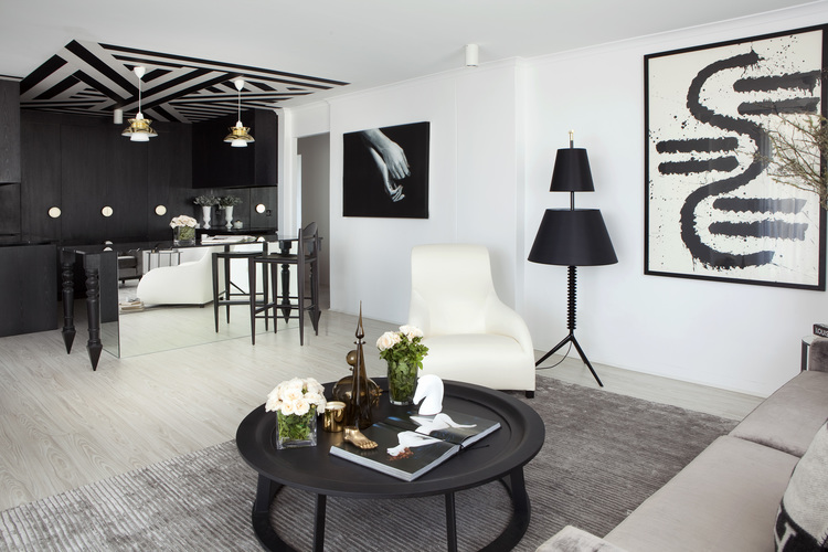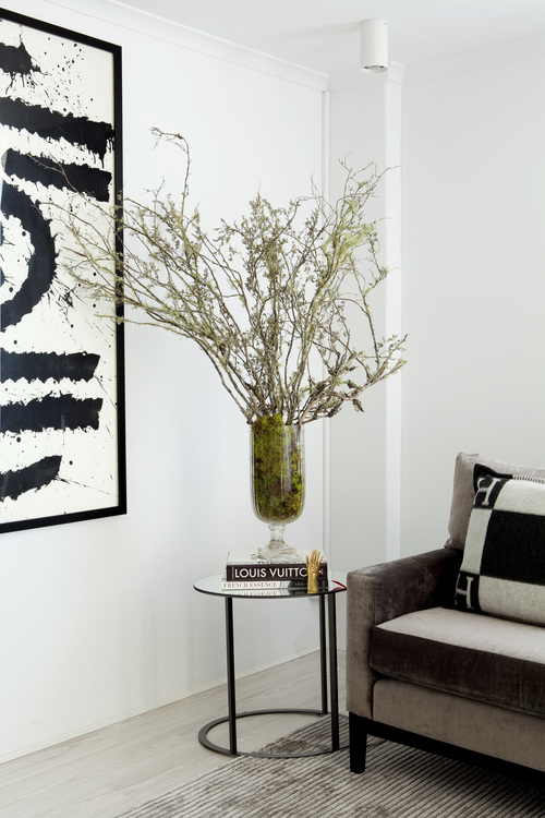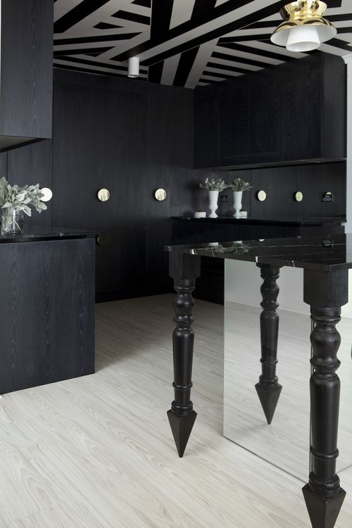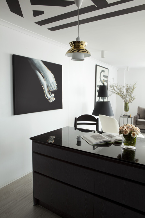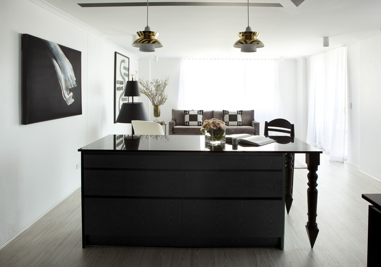 A sad little cookie cutter apartment has received a dramatic makeover by Brisbane interior designer James Dawson. His Marine Parade Apartment design features bold black and white wallpaper, polished brass custom designed door handles and a bespoke “hidden” kitchen island bench (sexy legs!). Have you noticed the trend of “non-kitchen” kitchens lately especially in small open plan areas? Perhaps not the best for family living but this bijou apartment is all about drama and theatre and definitely more striking bachelor pad than kid friendly hangout. Crack open the champagne darling. It’s in the fridge somewhere behind those gorgeous black doors.