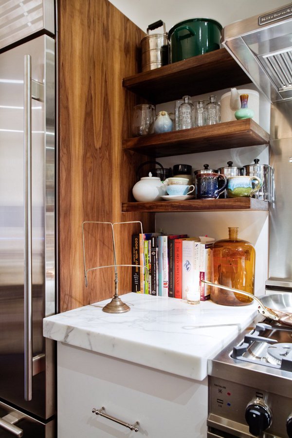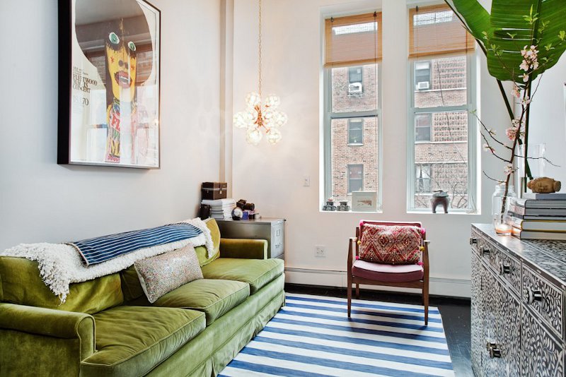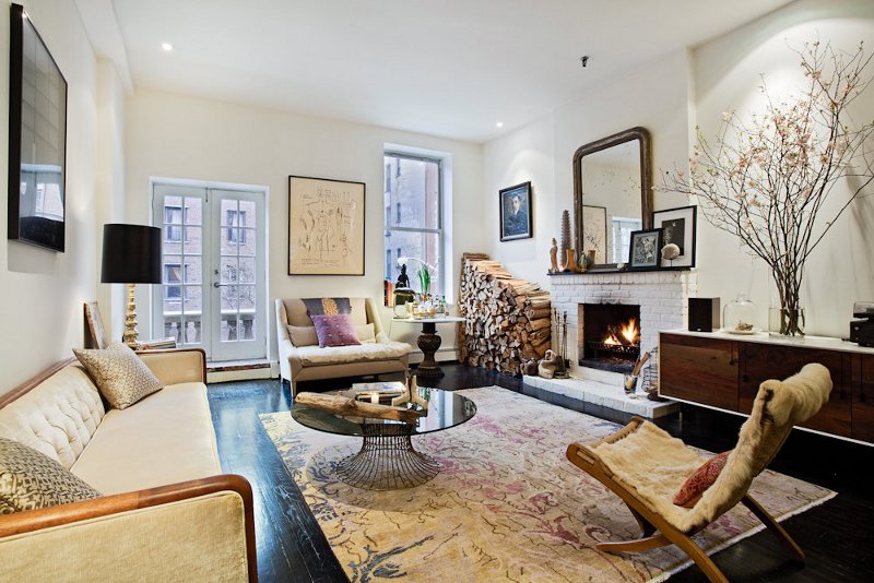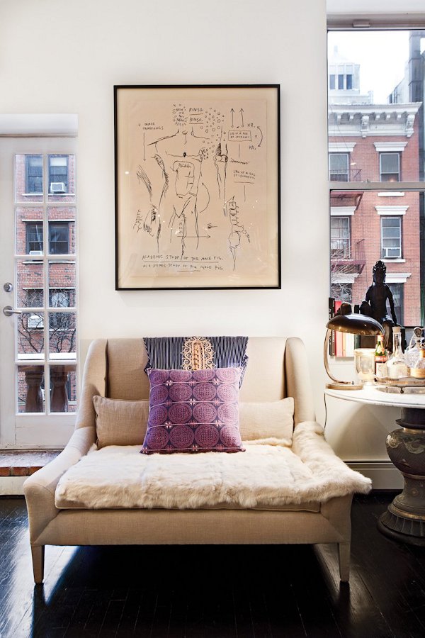 How do I love thee? Let me count the ways. I love the boho meets faded vintage, meets real life in the city vibe of this East Village, NY apartment by FIG Interior Design. I love how the living area transitions to dining and kitchen. I love a stylish open plan. I love the layers of detail, the textures, the little things, the cherished things, the clutter of things. I love that you can see lamp cords and that the sheets aren’t steamed wrinkle free for the shoot. I love seeing rooms by day and as the light fades. I love the personality and the panache. I love the drama of dark walls and the play of flames in the fireplace.When I daydream of living in New York this will be the place I do it in.
