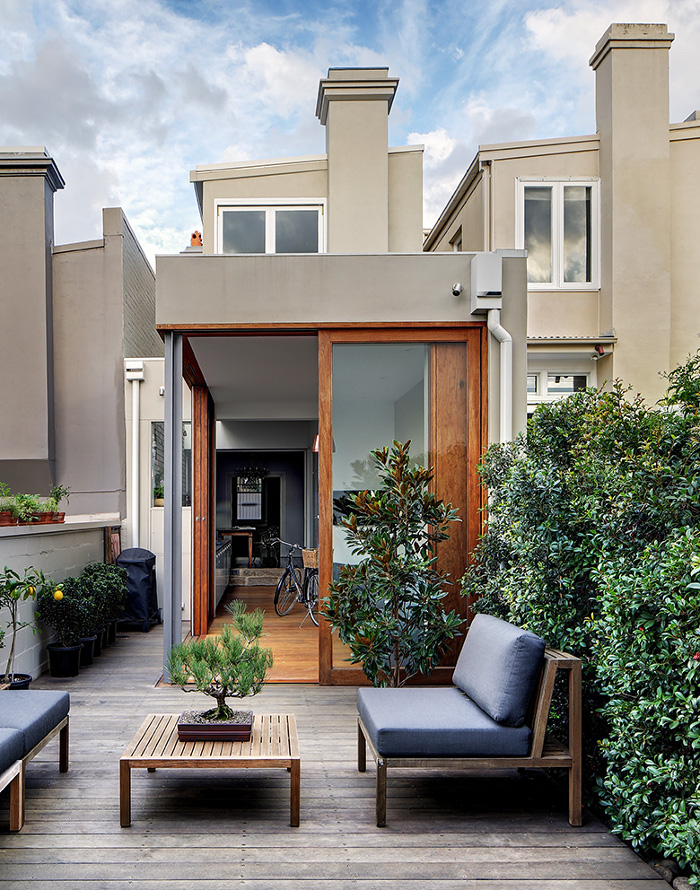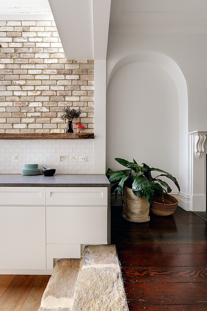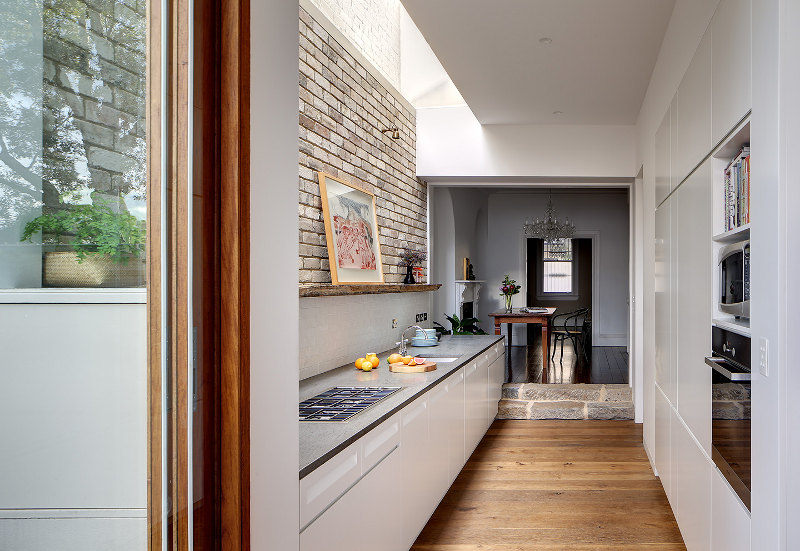 I love this light filled kitchen that provides the link between the old and new in this inner-city Sydney terrace house. Reclaimed bricks and rustic timber shelf balance the sleek modern lines and smooth stone benchtop of the galley kitchen. Light tumbles in from the skylight while the transition from traditional dining room to the modern alteration is made via worn sandstone steps. Finally the space reaches a small but stylish courtyard. Such a beautiful space for cooking. By Paddington based design firm Alexander & CO.