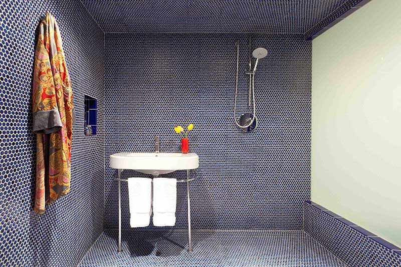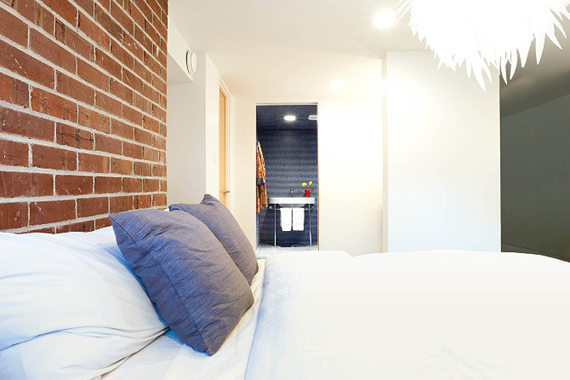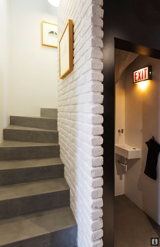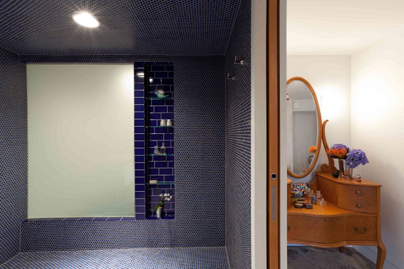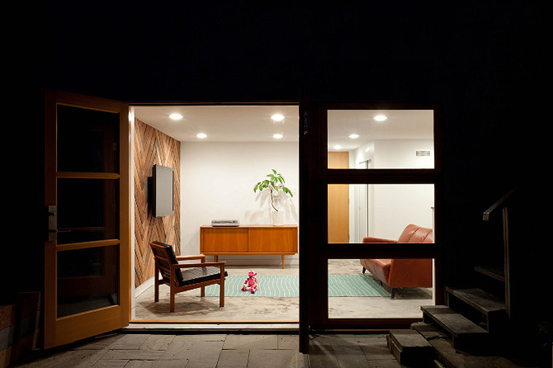I’ve always wanted to buy a really old home that has cool architectural features and renovate it, leaving some of the “old” intact. That is just what marianne amodio architecture studio in Vancouver did here. A complete transformation of a seldom used ground floor from basement storage to master bedroom and living quarters, this renovation was realized with the principle of exposing the layers of history evident in the 1927 home. The contrast between old and new is proudly pronounced: Original red brick fireplaces are revealed, their chalk inscriptions from previous owners left behind; old fir beams find new life as stair treads, and vintage fir planks salvaged from the demolition become a crafted herringbone feature wall. The concrete floor is uncovered, contrasted by shiny new tiles. A spectacular cool blue wetroom and powder room adjoin a new master bedroom; the headboard is the vintage brick fireplace.