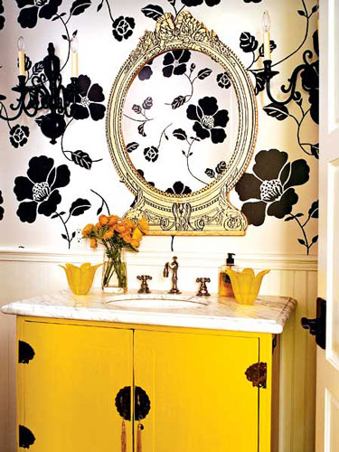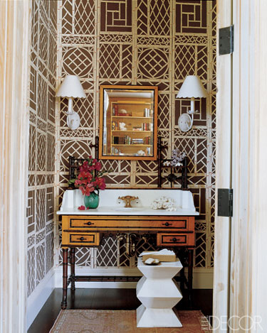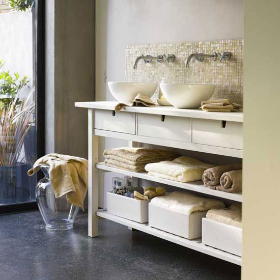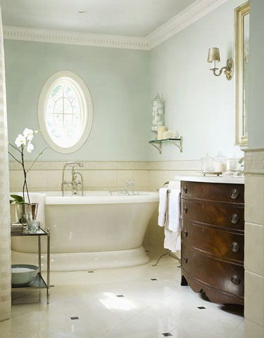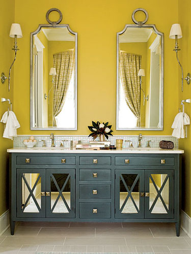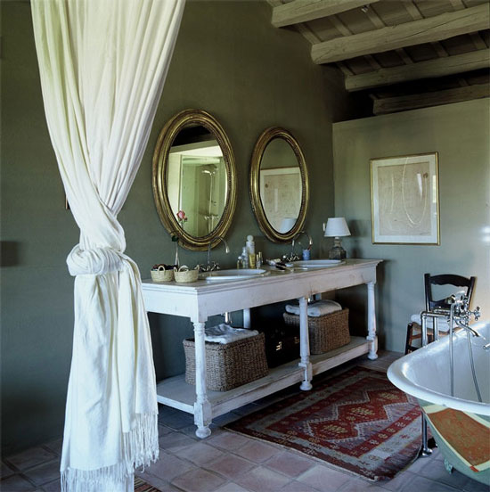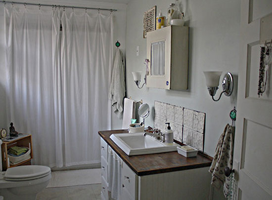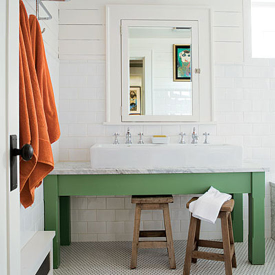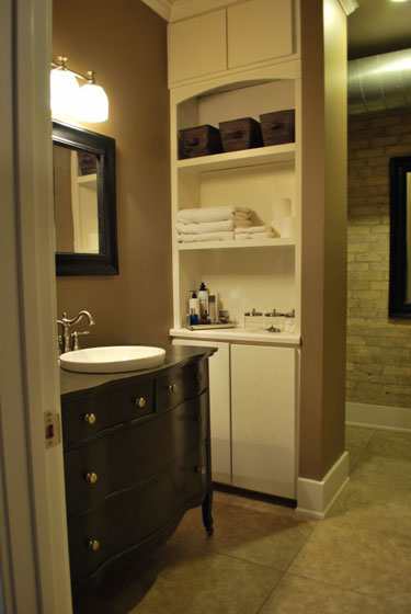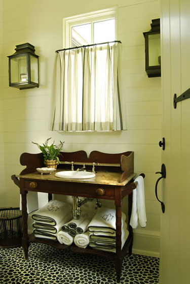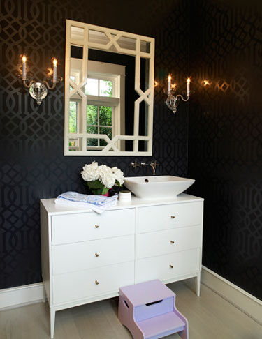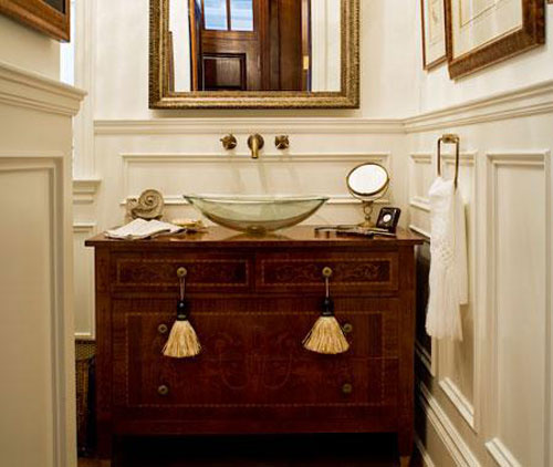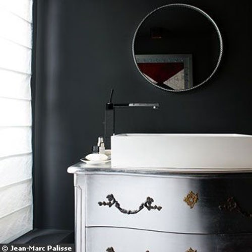 Sorry for my lack of reader request posts lately – things have been a little hairy for me (and with 9 cats now I mean that in every sense of the word). This one comes from Brooke: “I have one request: bathroom vanity’s using antique dressers. I am renting an apartment, and going to school to become a designer… and once I am all done and find a place of my own – I will be sure to find a fixer upper… and in that fixer upper will be many fab finds such as a vintage dresser vanity!” I adore dressers repurposed as vanities so I was shocked to find out I didn’t have that many photos of this brilliant idea. So below are some vintage dressers, tables, maybe some not so vintage dressers, and even an Ikea kitchen island.