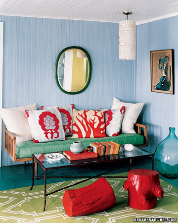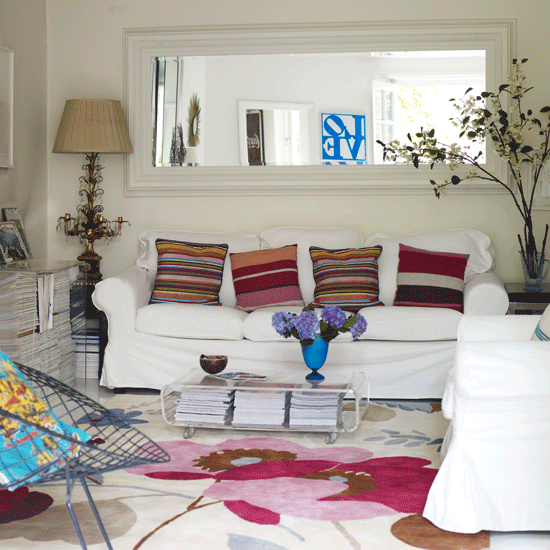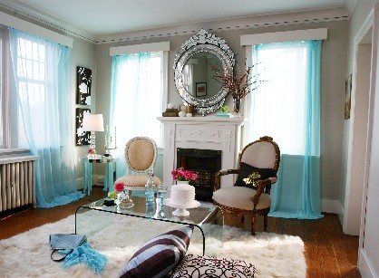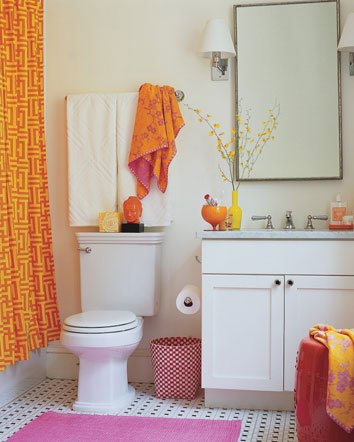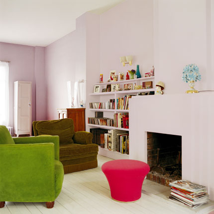 This reader request comes from Lia: “I take possession next week of a little urban cottage in Overbrook. I have pretty much no cash to do much of anything, but have to do some renos (redo hardwood throughout; upgrade electrical; paint, of course). I had a designer give me a hour’s consulation re: colours, but beyond that… I’m on my own. I’d like the place to reflect my artsy bent and be a sanctuary for my daughter and I. Do you have any ideas for a space of about 800 square feet, including an eat-in kitchen (70’s style brown wood-type cabinets, I’ll keep the linoleum for now, 10 by 14 feet), 12 by 14 foot living with with non-functional fireplace (brown brick and slate), the smallest bathroom possible (with pink and black tiles with white toilet and walk-in bath – that will have to be replaced), and a bedroom for myself (12 by 9) and for my three-year-old (10 by 9)? Do you have any images of cottage-sized, girl-pretty places?” What dug around my photo stash and found all sorts of small-ish spaces with a girly touch, which hopefully will inspire Lia to create a gorgeous little home for her and her daughter. A chick pad. 🙂 I found enough photos for 2 posts so here are some living rooms and bathrooms and tomorrow will be kitchens and bedrooms.