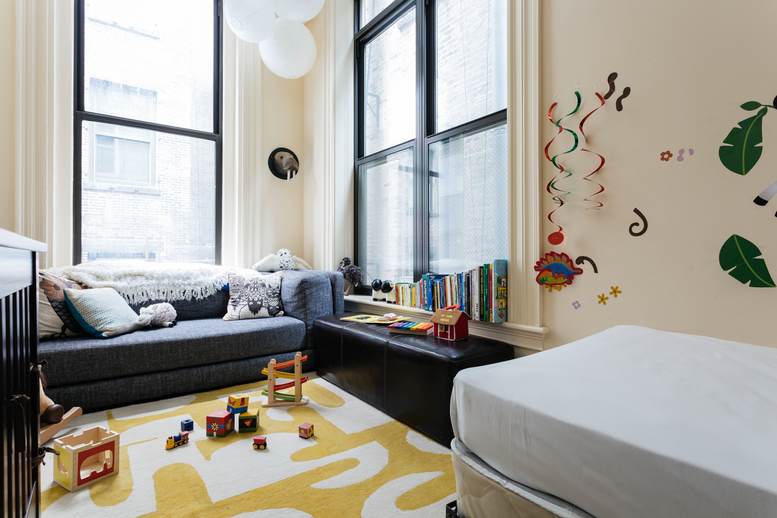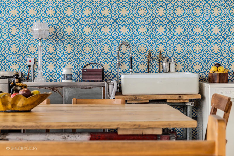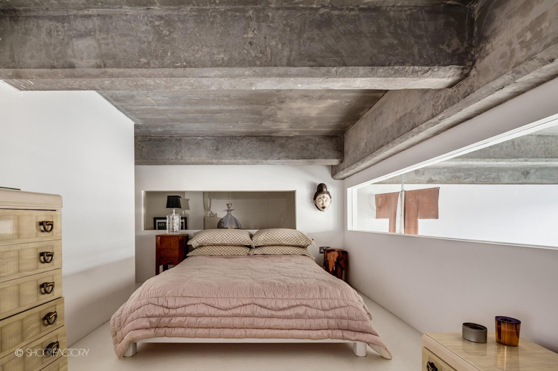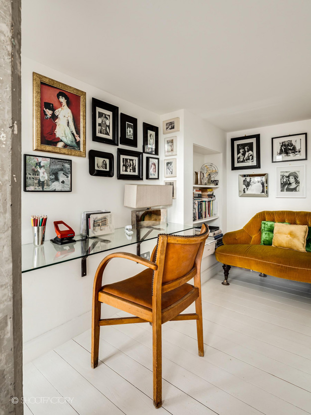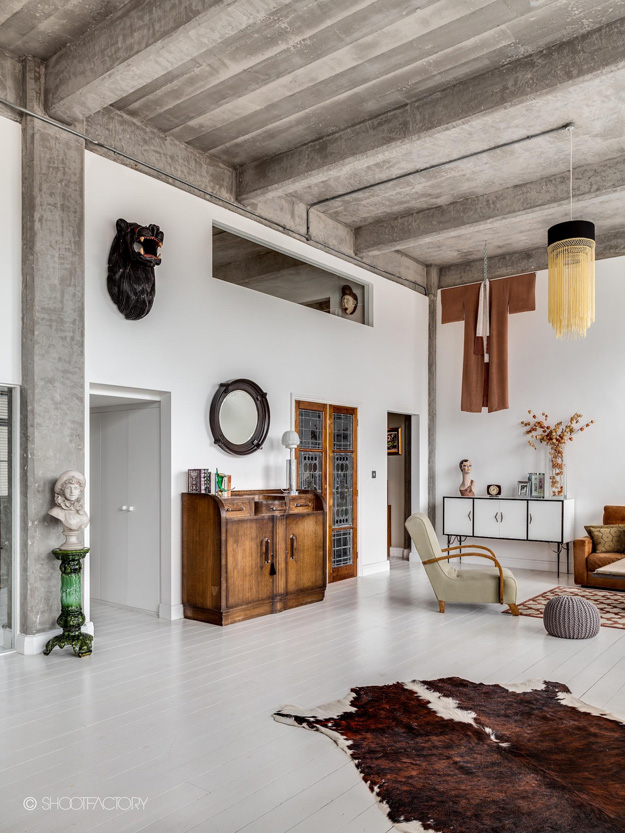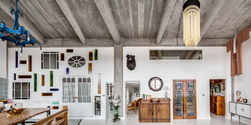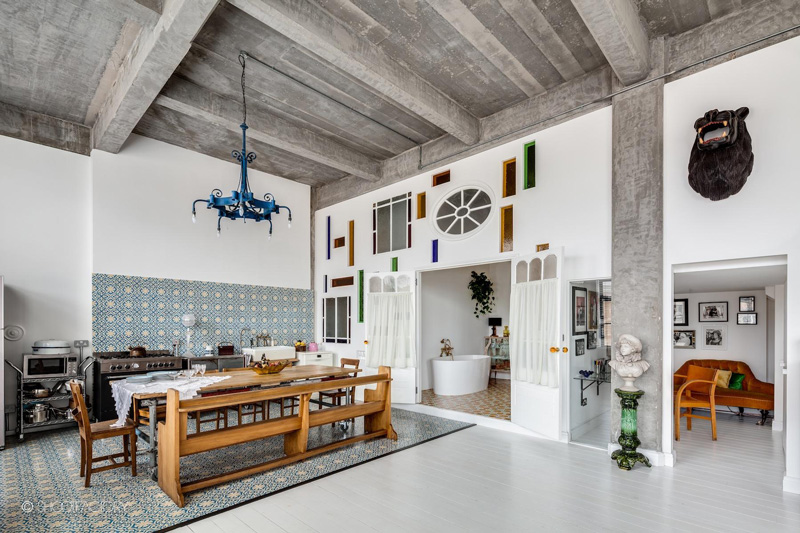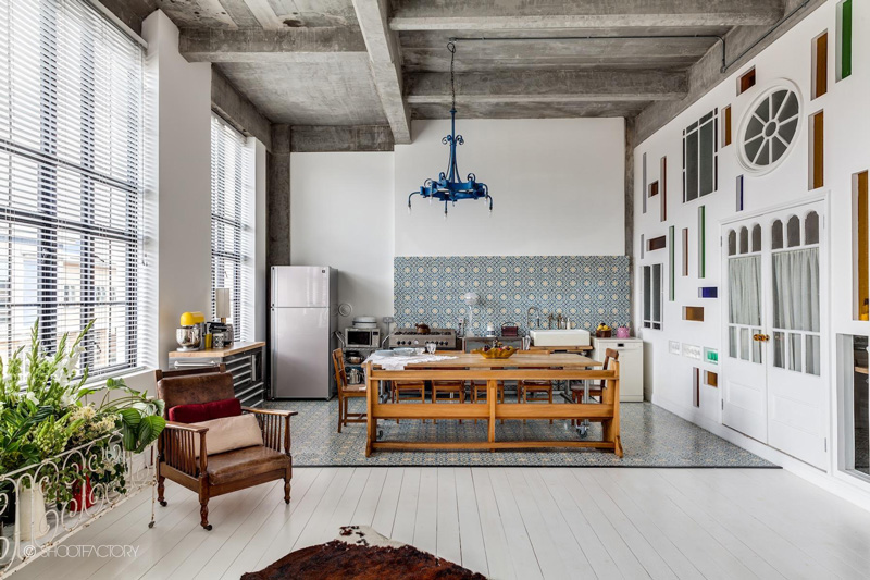 What a stunning loft. This 1200 sq ft space in London is a dream with massive windows along one entire side, concrete ceilings, white painted floorboards, and an eclectic touch with stained glass doors and windows and patterned tile. I would maybe redo the kitchen and add some actual cabinetry to make it more functional. Other than that the decor is really fun and random with an fairly simple colour pallet. LOVE this. Via Shoot Factory.