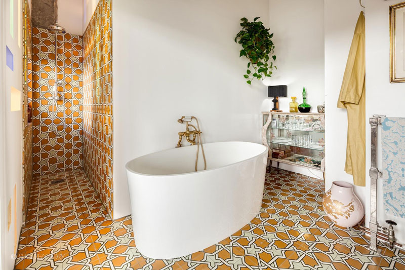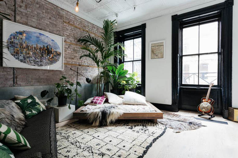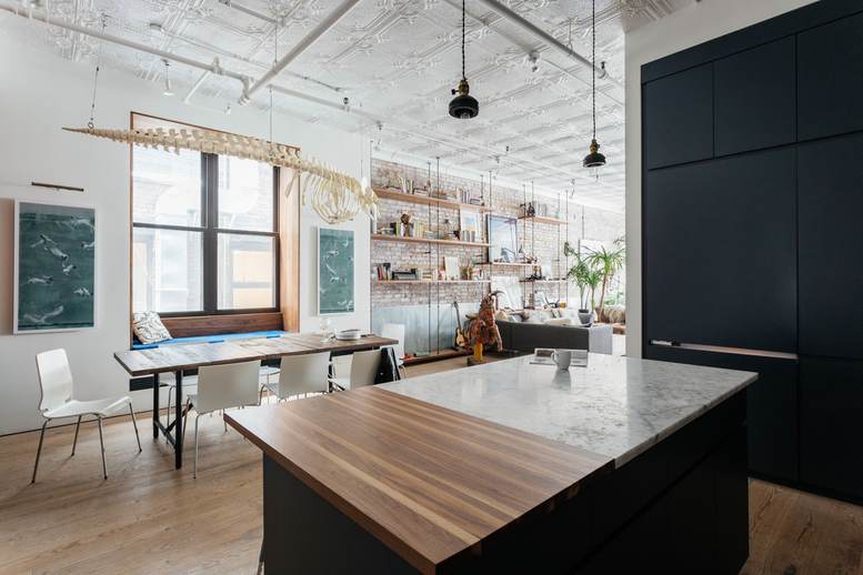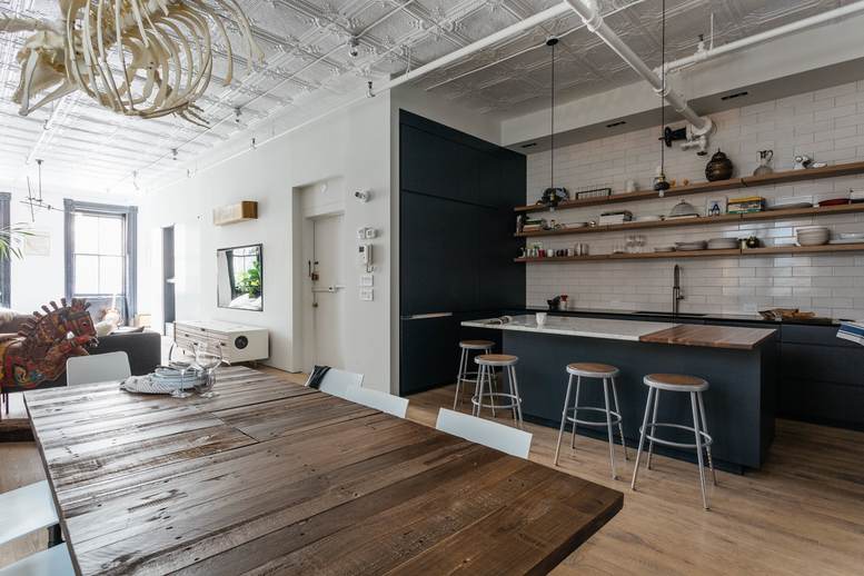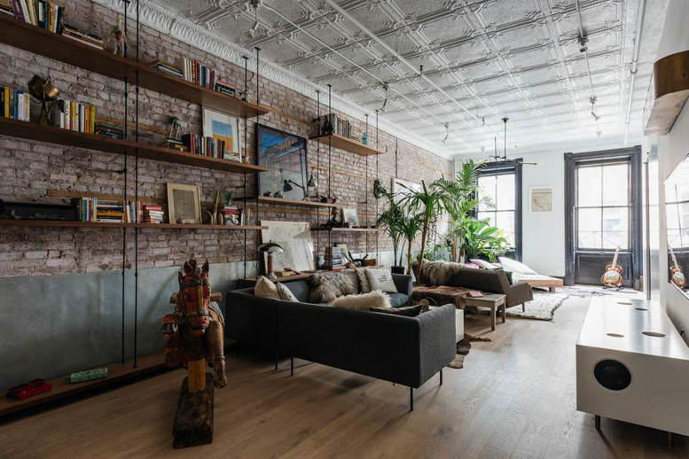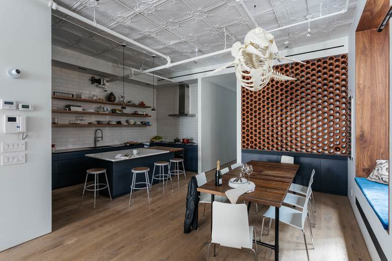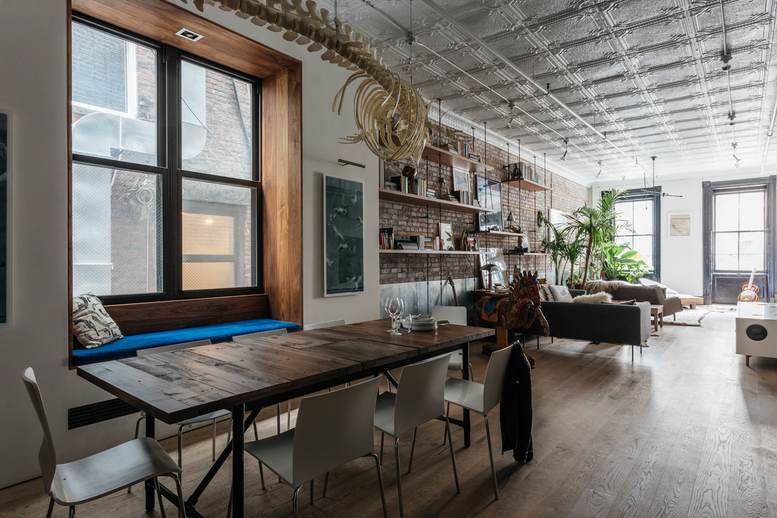 Or should that be the skeleton on the ceiling? It may be the deal breaker if you want to come on my virtual getaway to this loft style apartment in Tribeca, New York which ticks all the boxes. Exposed brick walls, light streaming in the the tall windows, a mini jungle, curios on industrial style shelves, great kitchen… and the skeleton above the dining table. I’ve been staring at it for ages trying to work out what the model is actually of. Ichthyosaur? Prehistoric razor toothed dolphin? A cousin of the Loch Ness Monster? It would certainly make for an interesting dinner party conversation. Franklin Place is available through onefinestay.