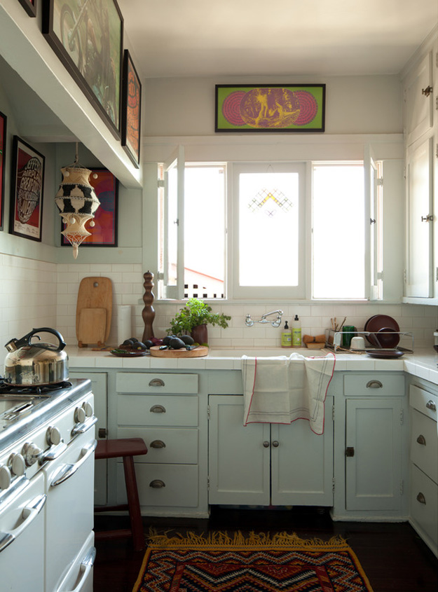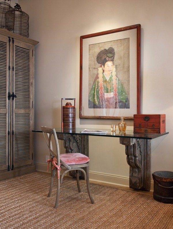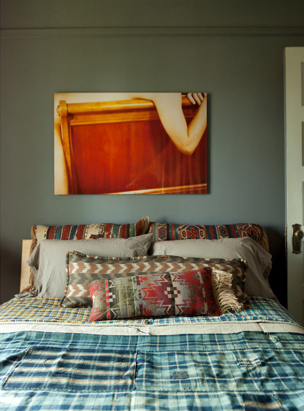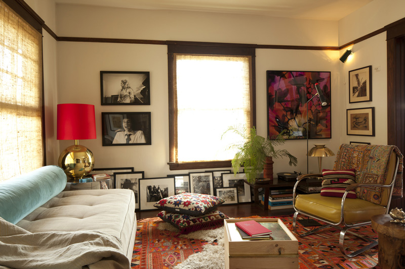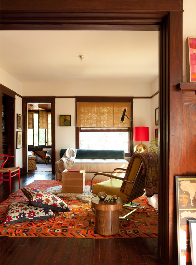 I adore this home. All that wood, the massive amount of art mostly leaning casually on the floor, the gorgeous kilim rugs and pillows, the burlap window treatments…it does not get much cozier than this. By Commune.