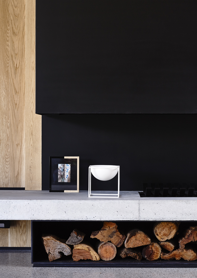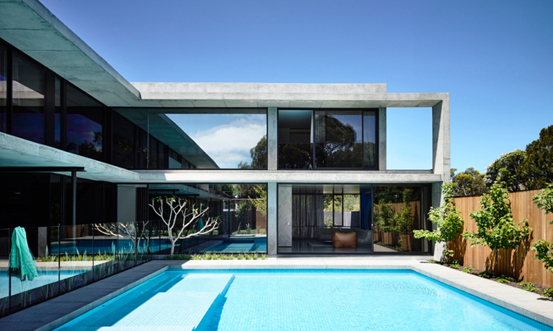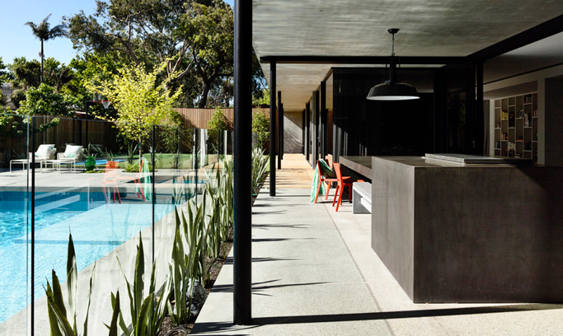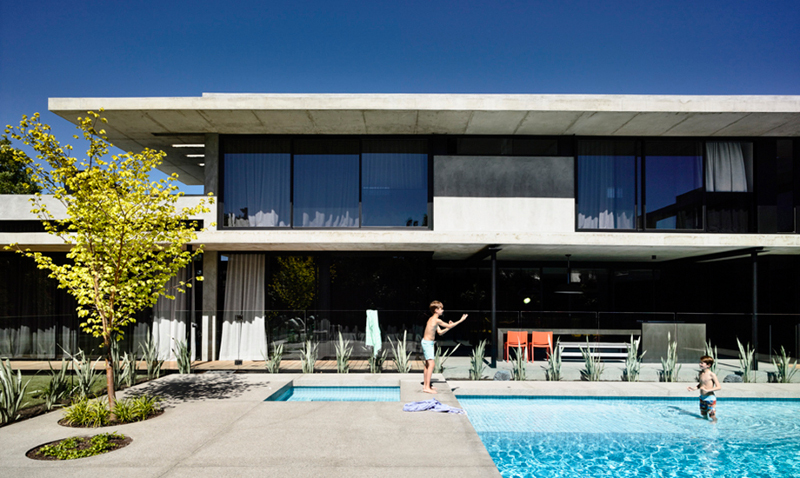 This L-shaped concrete family home embracing a pool and outdoor entertaining space has stark modern lines tempered by timber tones and soft furnishings. The standout mural is by Lucas Grogan. Style set in concrete by McKimm.