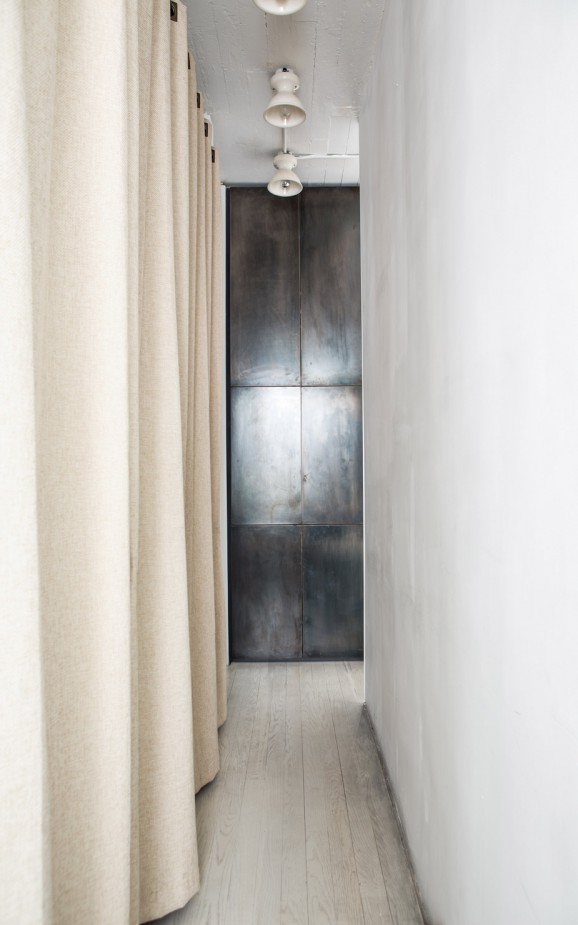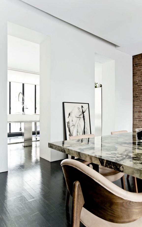 Nandini Bagchee is a New York architect who is working on her own awesome project – the renovation of a 2800 sq ft Brooklyn townhouse. OMG what great bones this place has! Exposed brick, such beautiful woods, lots of light. Even as a work in progress she’s a looker. A three story townhouse on a quiet tree lined block in Brooklyn was converted into a parlor floor apartment and a triplex. Within the shell of the existing brick building, we re-worked the interior spaces to let light enter more dramatically and to create a strong sense of movement along the axis of an existing oak stair. The second floor walls were removed to float an open kitchen with adjacent living and dining areas. The upper and lower floors function to house the more secluded activities of sleeping and study. This house is a private project where the arsenal of salvaged doors, hardware, fixtures and other materials that we have collected through our years as dumpster divers, finally found their place. Participating in the physical building process allowed us to work more incrementally, realizing that the art of renovation is just as much about subtraction as it is about addition. The pine floors and white walls, common to a lot of modest Brooklyn apartments provide a canvas of the everyday upon which the more “designed” moves are inscribed.