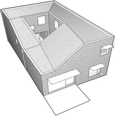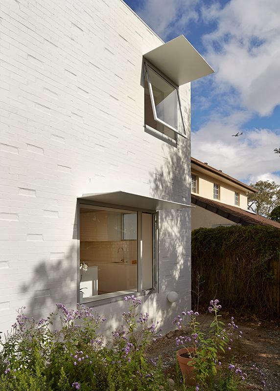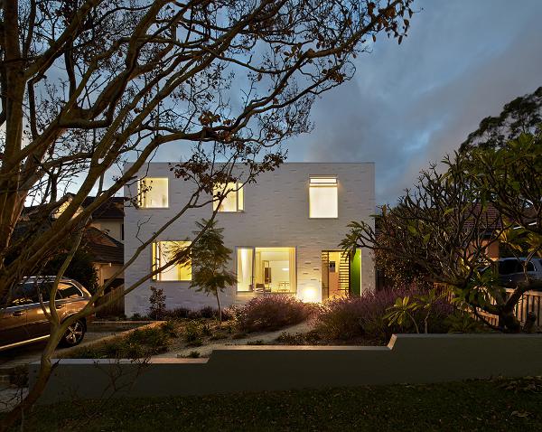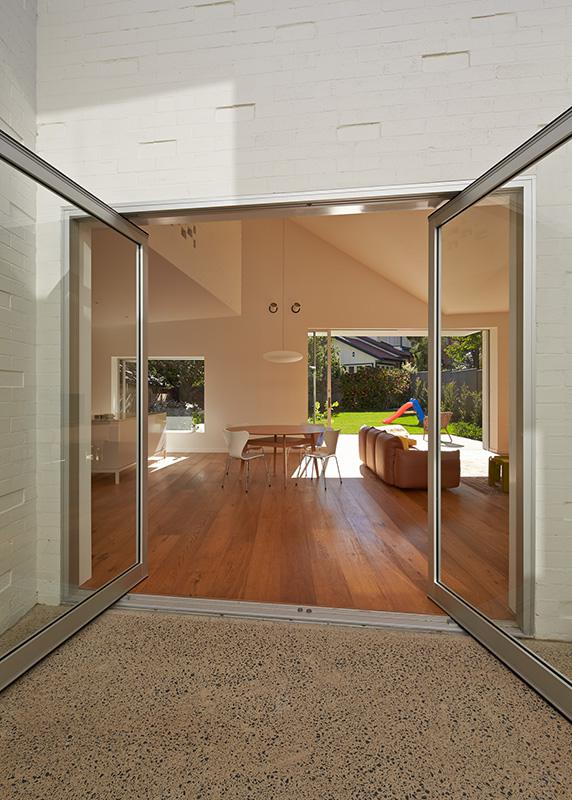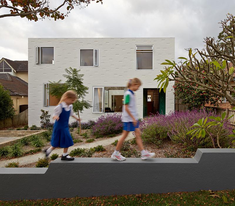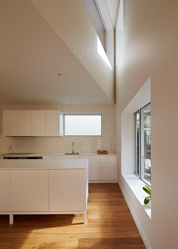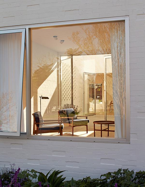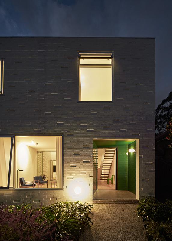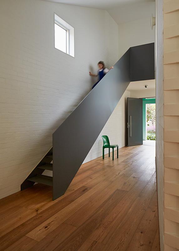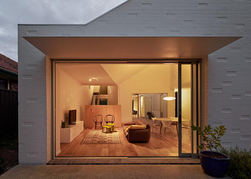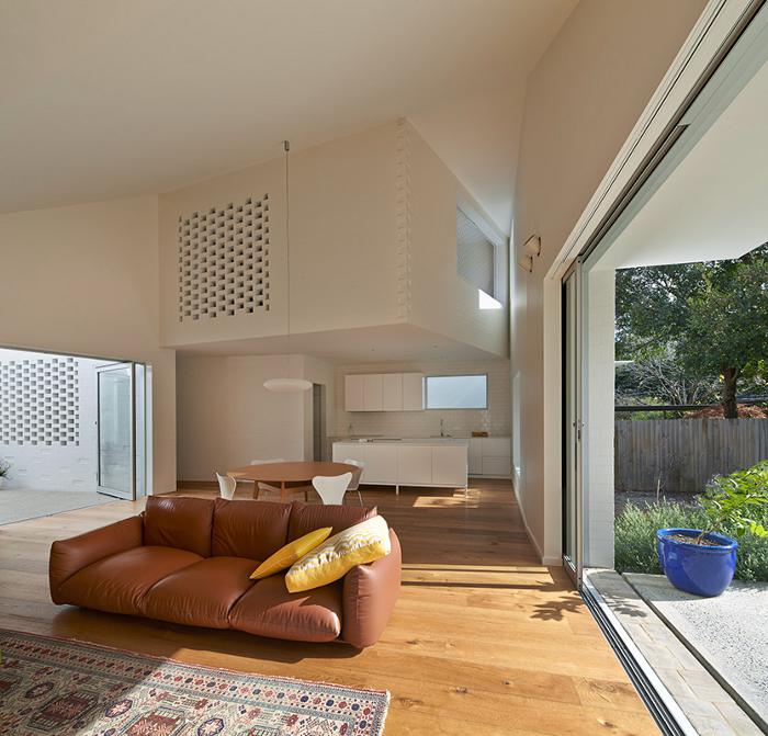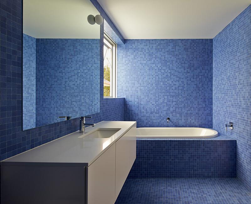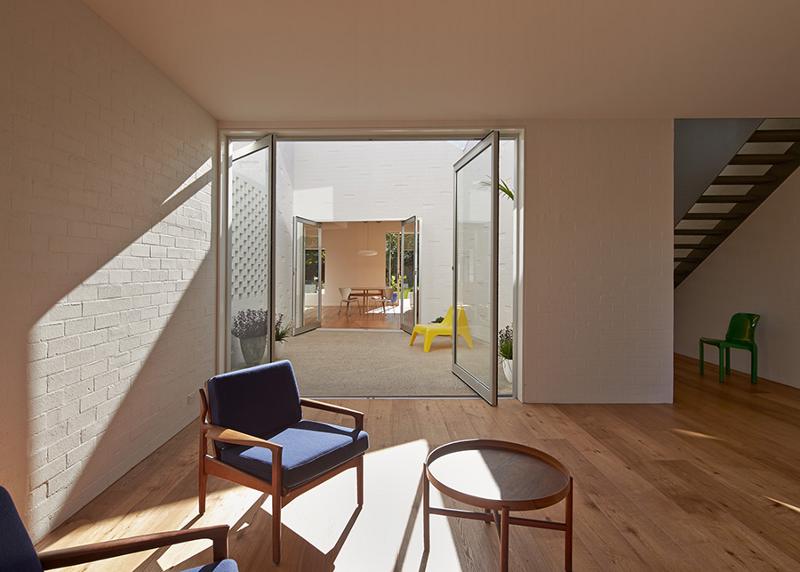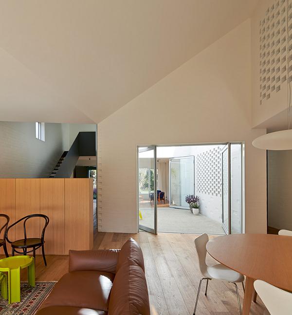 A white box with internal courtyard. Outside to in to out to in to out. Beautiful light penetrates into this clean lined home. Love the kids’ playroom above the open plan living area, the brick pattern, the steel stairs and the bluest of blue bathrooms. Riverview House by Bennett and Trimble.