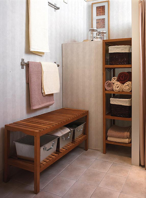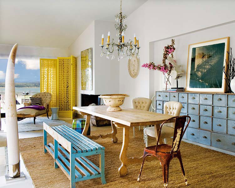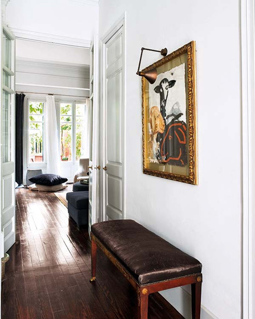 I have benches on the brain, as the one from ReOrient that I purchased last weekend was delivered yesterday. I have a random grouping of chairs at my dining table, and some of them I’ve been wanting to get rid of, so I figured I could use the bench on one side and my 2 white Panton S chairs and an Eames shell chair on the other. To my horror, the bench is about a HALF INCH too long. *&^%!!! There has got to be a way to rectify this but so far I haven’t come up with anything yet. Since I’m home sick with an awful cough today I will see what I can do. If there is nothing I can do about it (likely), the bench will reside under my living room window, and act as an end table for the couch, a perch for the cats to bird watch, and a spot to put shoes on/off at the front door. (Only in a 12′ wide house can you have something perform 3 functions just because it’s long). Benches are, in my humble opinion, a very underused piece of furniture. They are great in a living room when you want a good sight-line into the next space but need the seating. Benches are handy at a dining table because they can push under the table (if they’re not too long like in my case!) and not take up space. They are cute at the end of a bed to stash books and extra blankets, and fabulous in an entryway to throw your purse on and sit to put on shoes. How about in a bathroom to toss your clothes on before jumping into the shower? I also love them in a hallway to fill the void since they are typically nice and narrow. Here is a round-up of photos of benches I found in my stash. (P.S. I did a bench post a while back here).