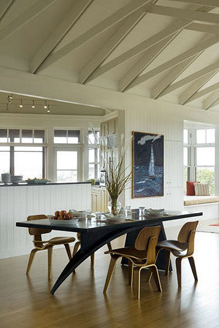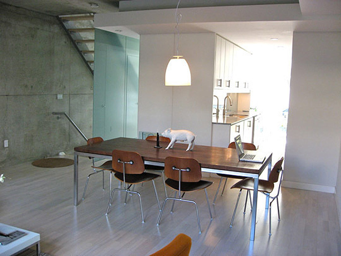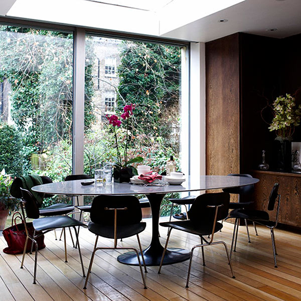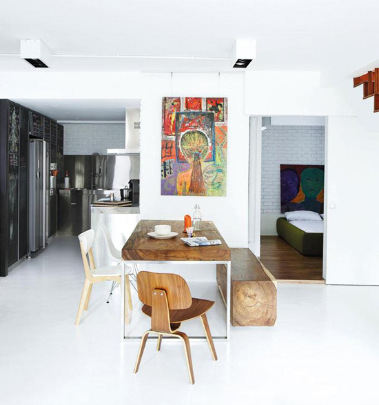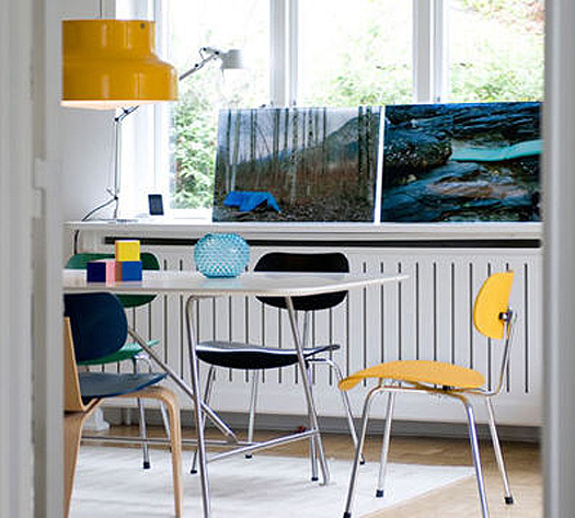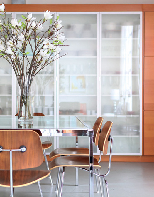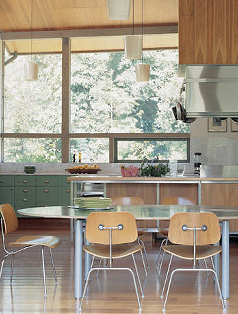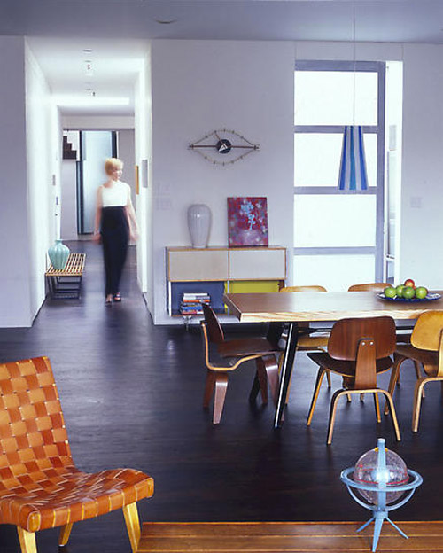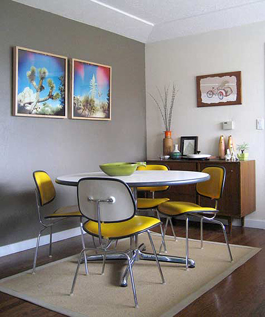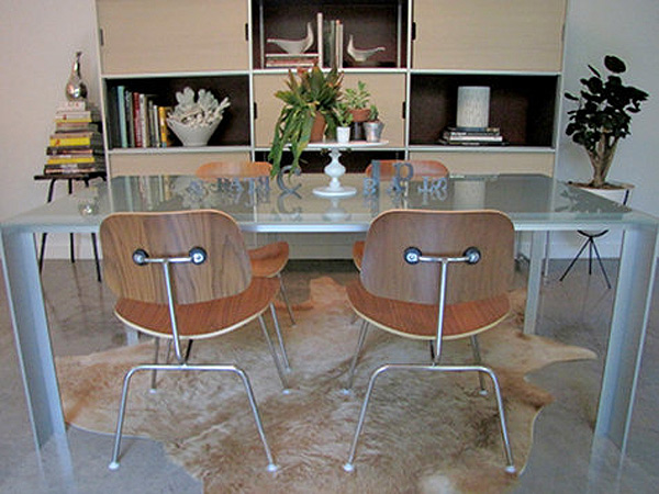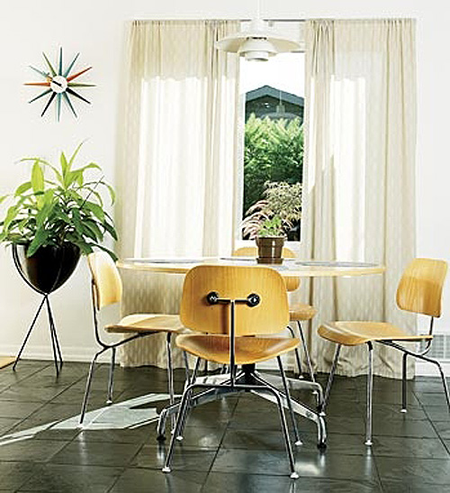 A reader named Monica recently scored 3 Eames LCM chairs at an estate sale (lucky girl!). Here’s her dilemma: I’d like to use them as dining chairs, but I know they’re more lounge-type chairs (hence the L in the name). They’re not super low, but you end up leaning back more than in a regular dining chair. I see the Eames shell chairs in dining rooms all the time, but never these. Do you have any examples of dining rooms that use these? I’m thinking about pairing them with a wood table and a built-in- or freestanding-bench along the other side. They actually come in a 16″ lounge version which is what Monica has, and an 18″ dining chair version. She’s trying to convince her husband they will work as dining chairs because she has enough occasional chairs (although I personally think there’s no such thing as too many chairs!). I went through my photo stash and found photos of it as a dining chair, and I threw in some of the LCW version too at the end. I love these as dining chairs – they’re a great break from the normal Eames molded plastic chairs everyone seems to use.