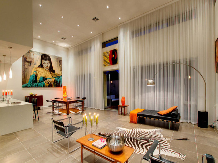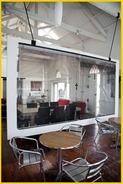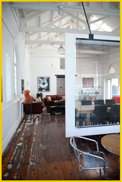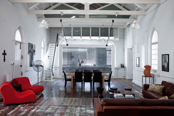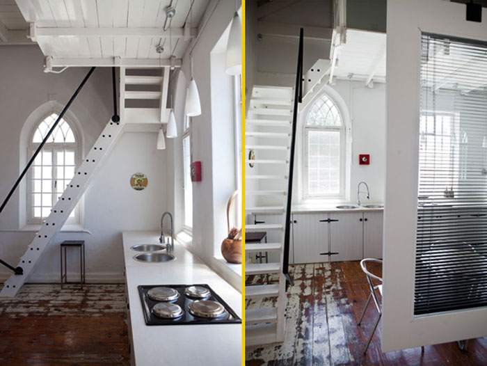 Jo and I have a thing for church conversions. The creativity to turn a structure like a church into a home is pretty inspiring to think outside the box. I came across one last night while I should have been doing other more important things (like finally getting my tax paperwork together, late of course). This conversion (found here) is of an 19th century Protestant church in downtown Cape Town, South Africa. It’s painted all white with wood floors left in their original, rough state with modern furnishings to liven the place up. And the enormous suspended frame with blinds is a great way to delineate the kitchen from the living/dining spaces.