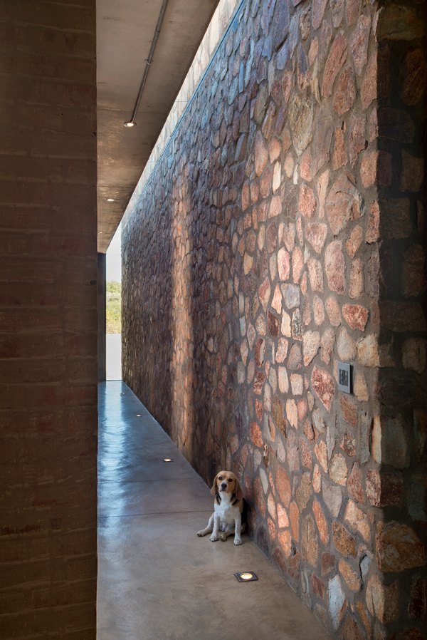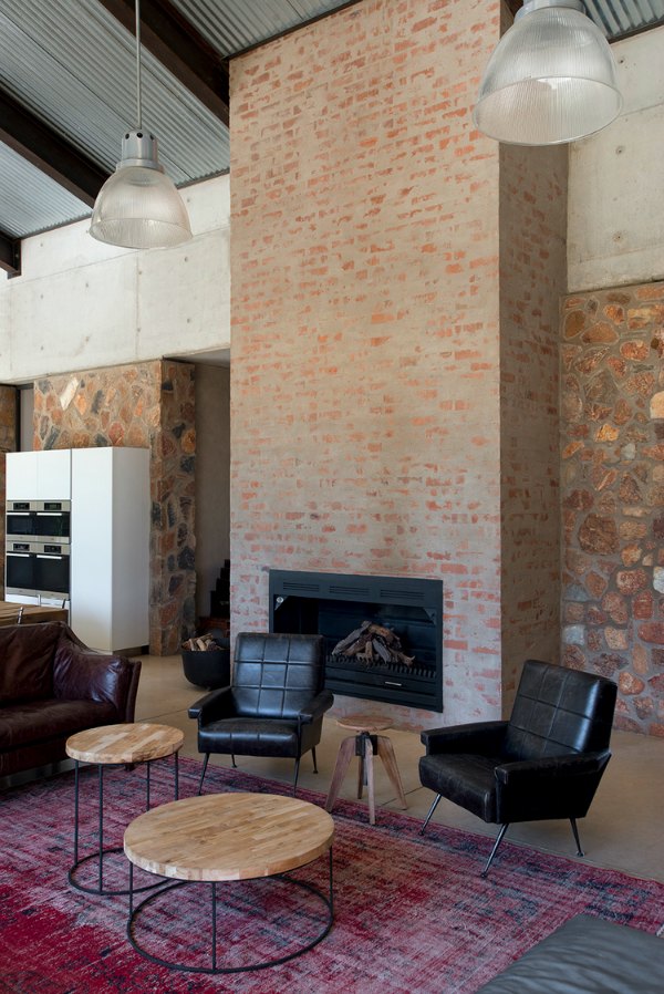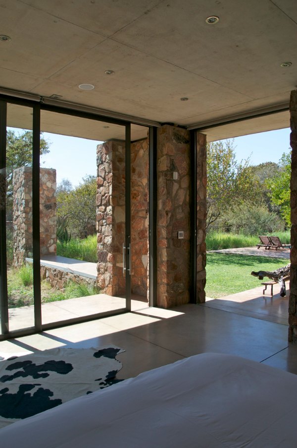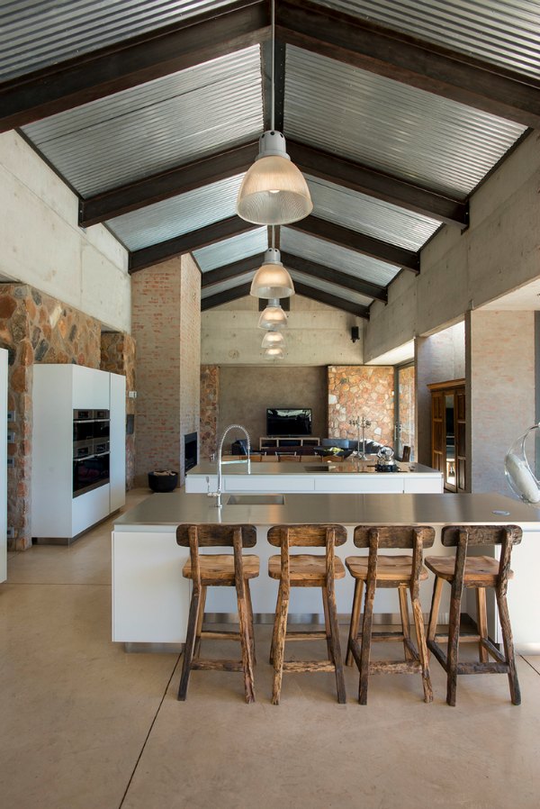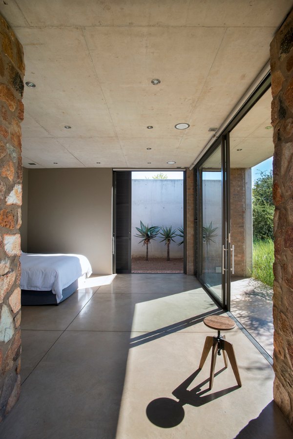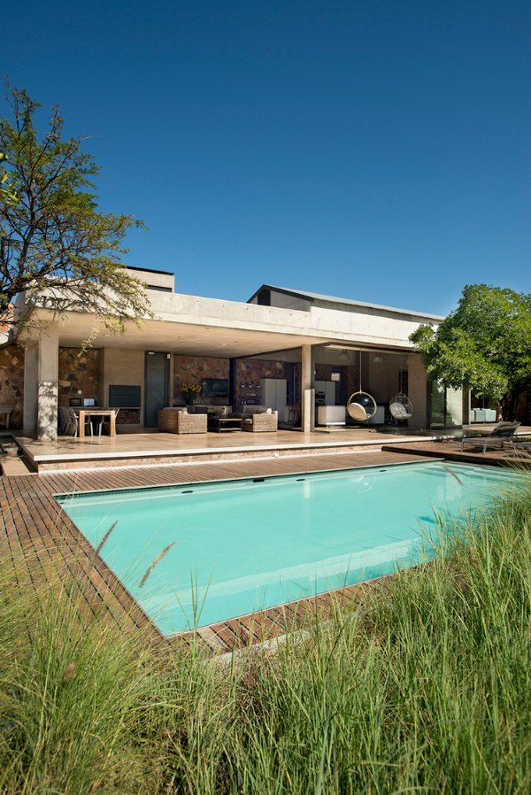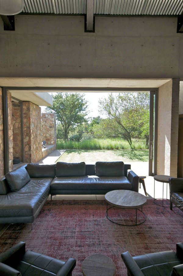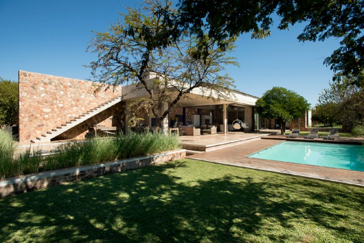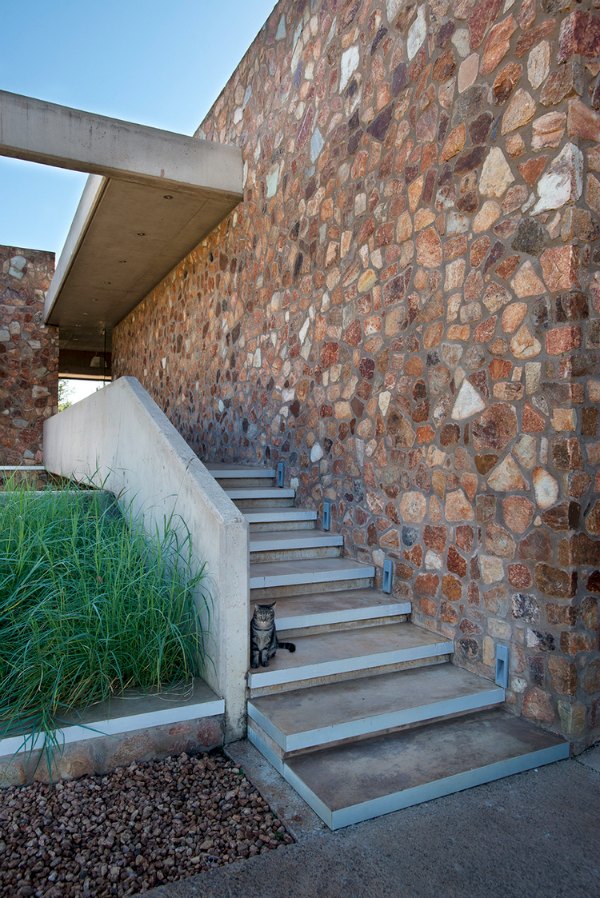 On the outskirts of the town of Marble Hall in South Africa, bordered by natural bush, this modern family home references the raw, simple beauty of traditional South African farm architecture. With its solid stone and concrete walls, the house turns its back on the public providing protection for the private areas within. Still with all its solidity and mass the spaces within are surprising light and open. House Kleynhans by Pretoria-based Thomas Gouws Architects.