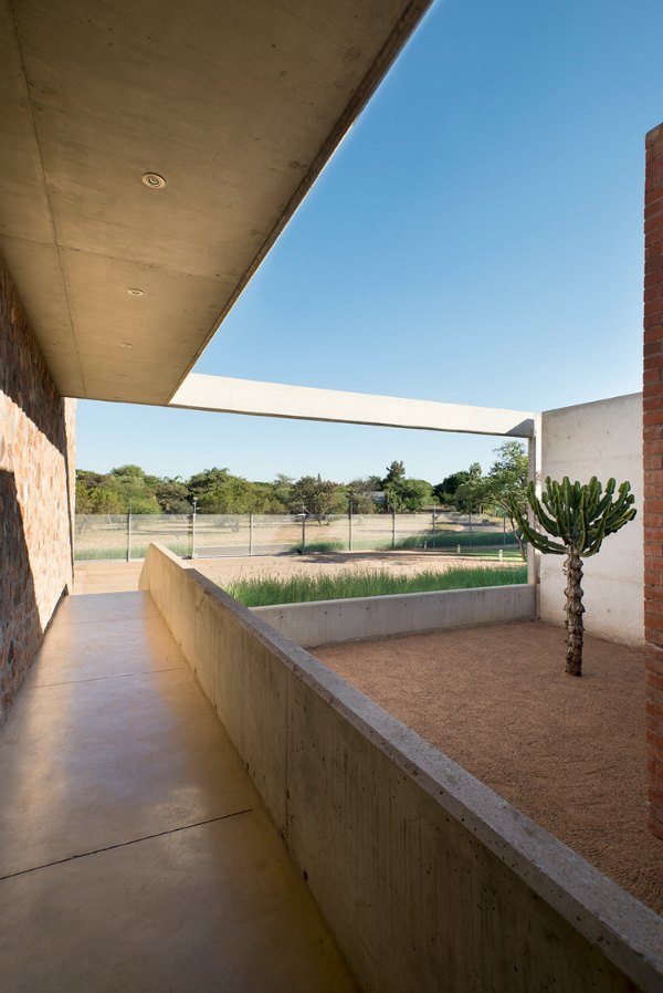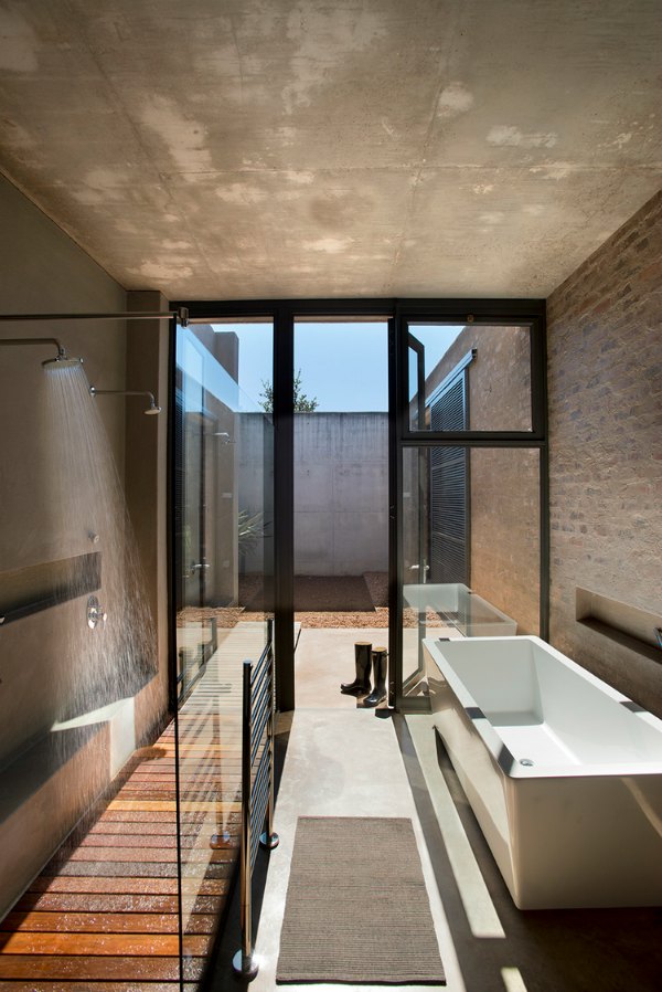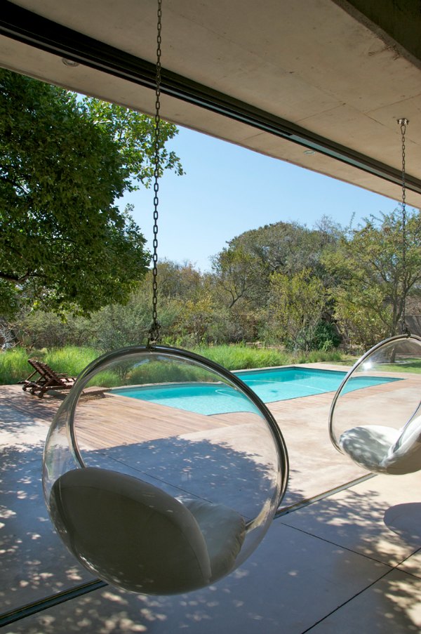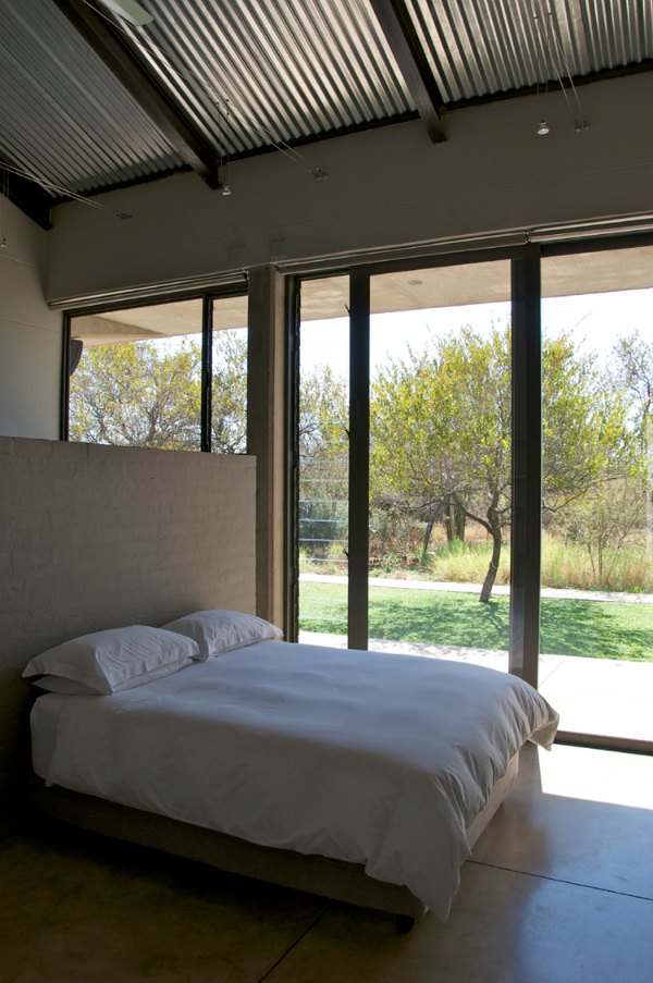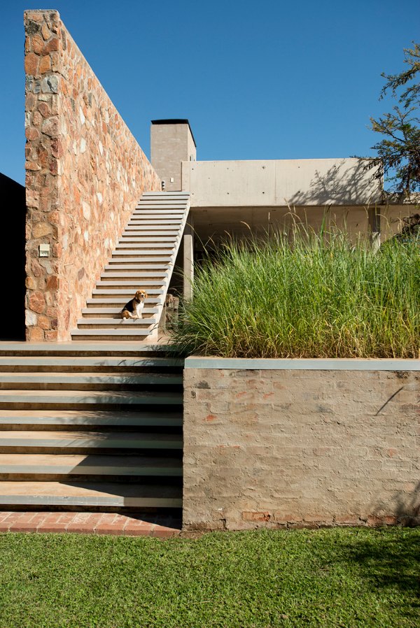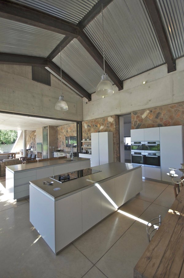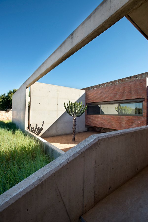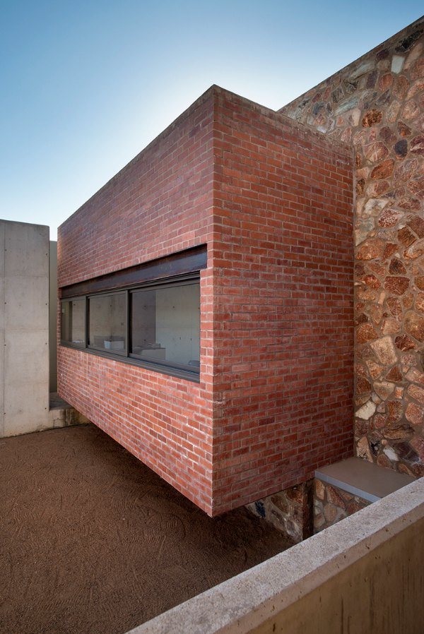 On the outskirts of the town of Marble Hall in South Africa, bordered by natural bush, this modern family home references the raw, simple beauty of traditional South African farm architecture. With its solid stone and concrete walls, the house turns its back on the public providing protection for the private areas within. Still with all its solidity and mass the spaces within are surprising light and open. House Kleynhans by Pretoria-based Thomas Gouws Architects.