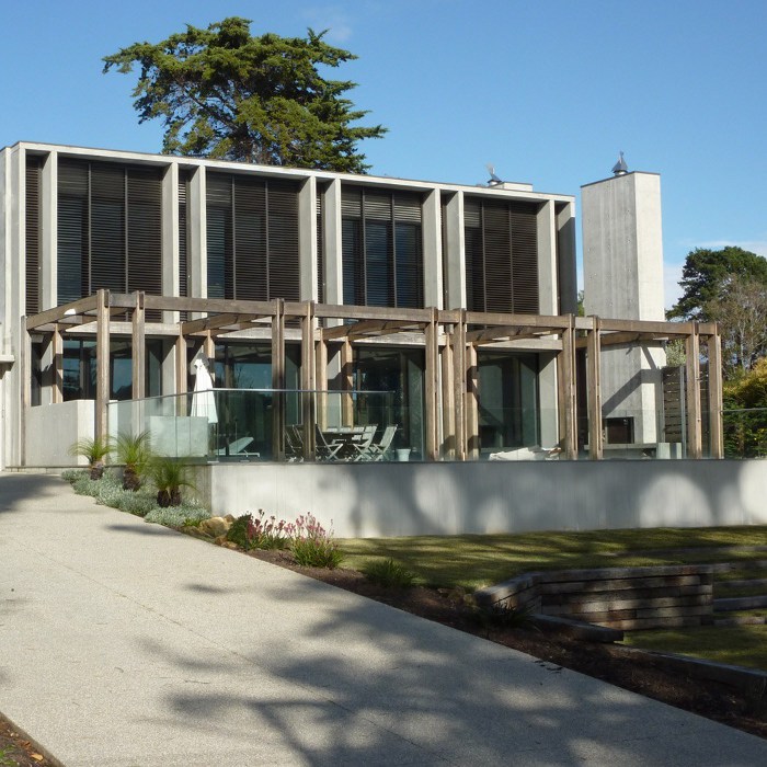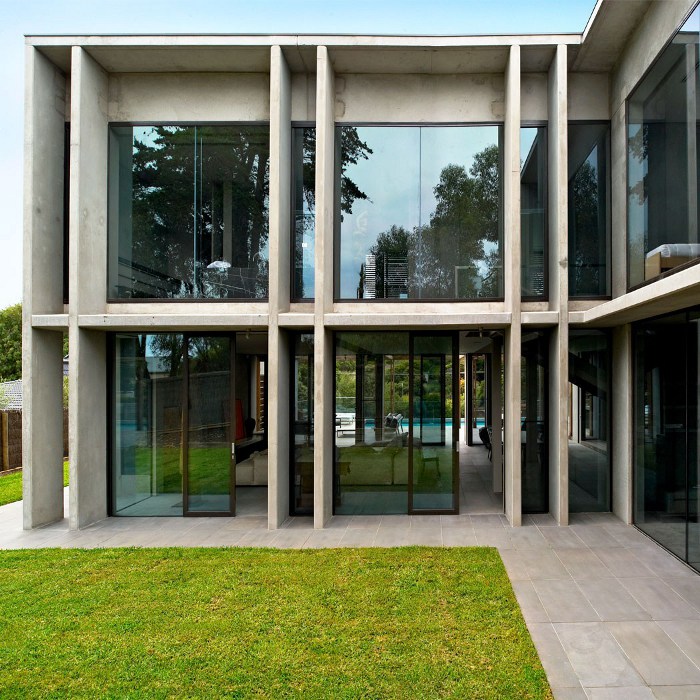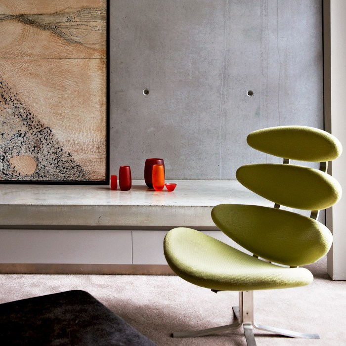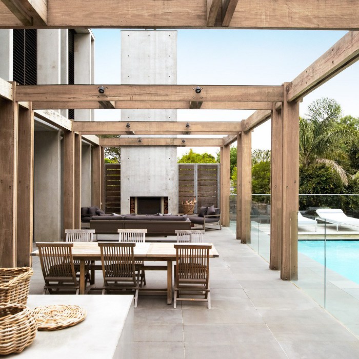 This L-shaped concrete family home embracing a pool and outdoor entertaining space has stark modern lines tempered by timber tones and soft furnishings. The standout mural is by Lucas Grogan. Style set in concrete by McKimm.