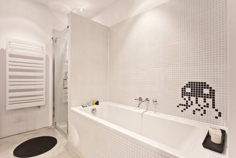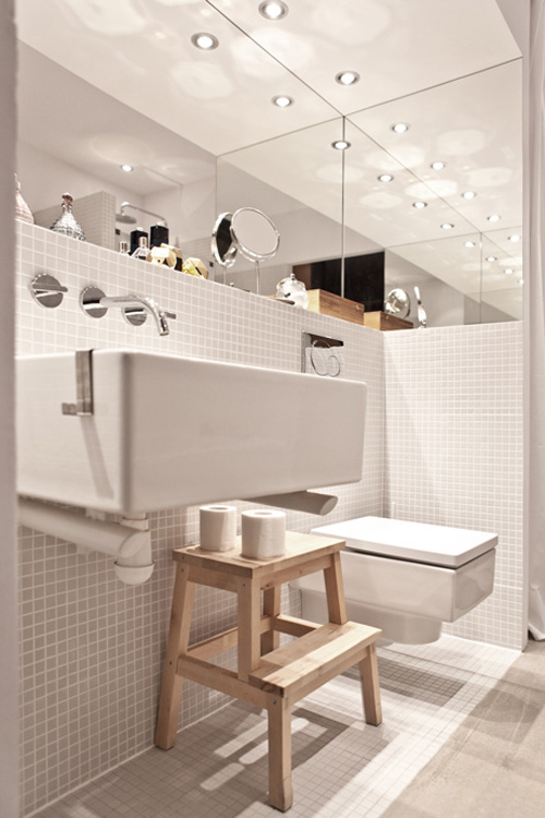 In order to bring more nature into this urban house, floor in the living room was covered with cow hide and bathroom sliding door are raw MDF with old plank print. The owner was really enthusiastic about the idea of making a tree branch chandelier: