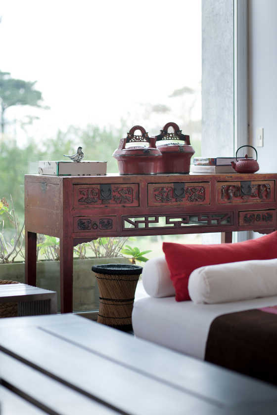 Natural materials were used to add warmth and texture throughout. Jerusalem stone flooring extends from the main entrance through most of the internal and external spaces giving way to fumed oak floors in the living and dining areas, as well as American cedar for the doors and pergolas and Ipe for the pool decking. This natural but uncluttered linear language was carried through to the decor by Mark Rielly of ANTONI ASSOCIATES who opted for solid timber pieces. Leather and suede were chosen for the upholstery. Feature lights are also strategically placed to add drama and definition to different spaces. The symbiosis between the decor and architecture is such that the overall impression is that of a clean but carefully considered scheme that soothes with its high-end modern appeal.