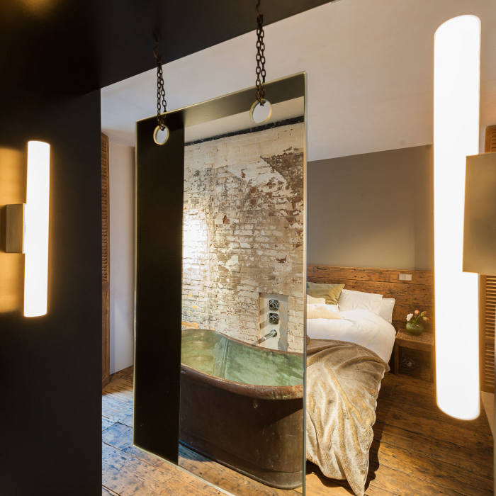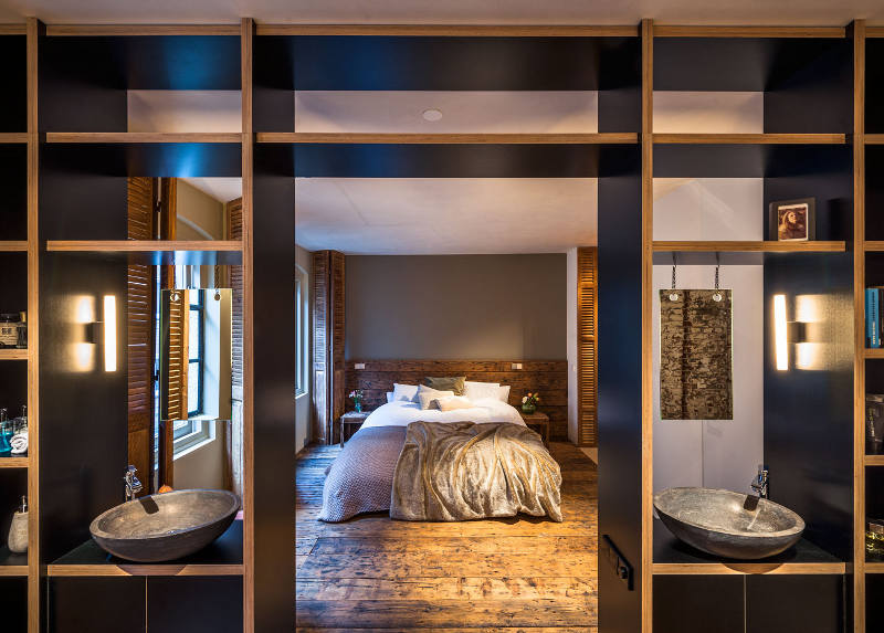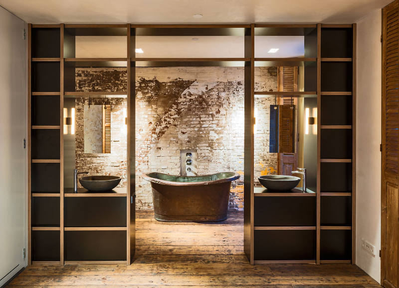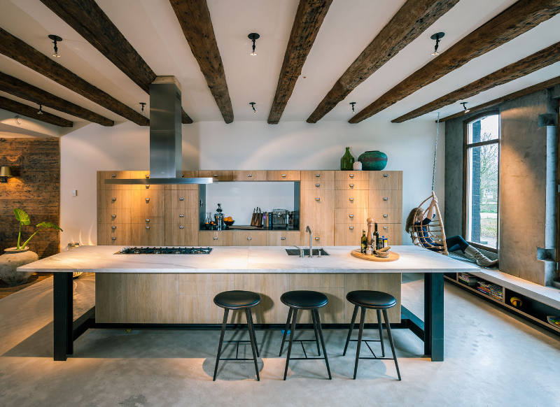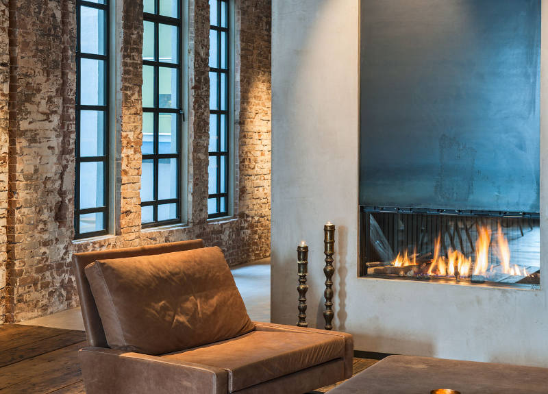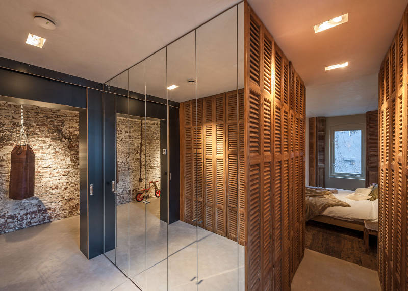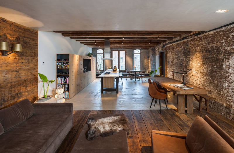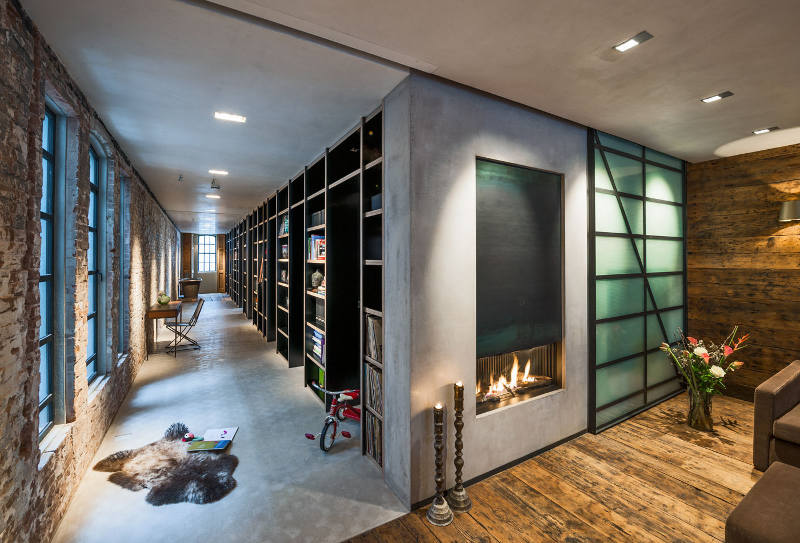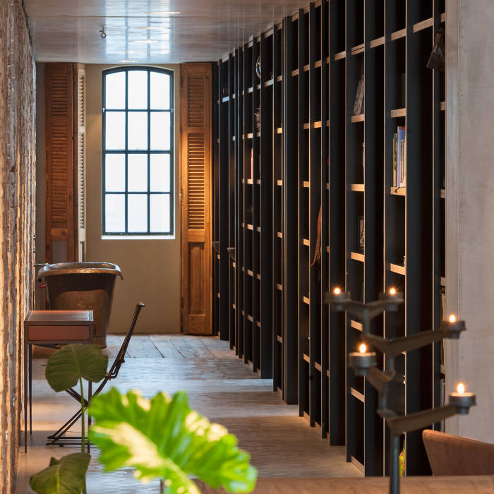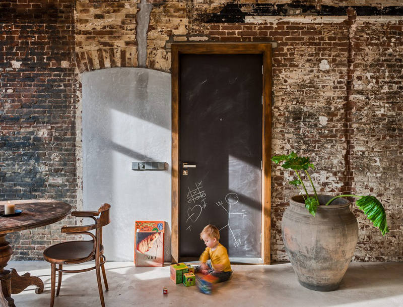 A former office and gambling joint reinvented as a family home. This stunning loft with its industrial materials palette of exposed brick and concrete is warmed by beautiful old wooden doors and floors. Highlights for me? The bath, all the storage, the shutters and, of course, that brick. De Korendrager by Dutch interior design and branding agency TANK.