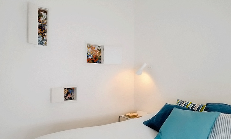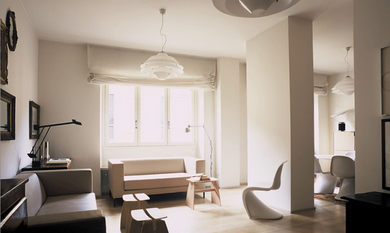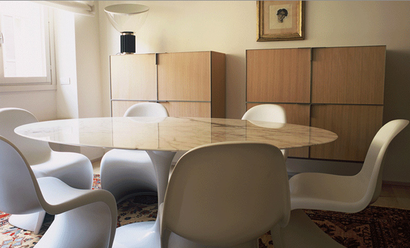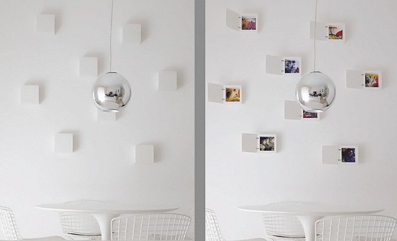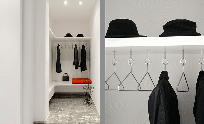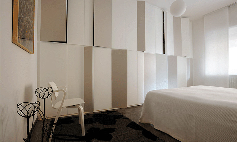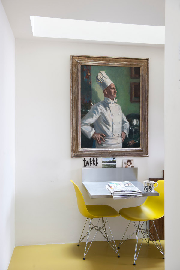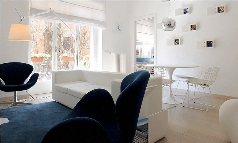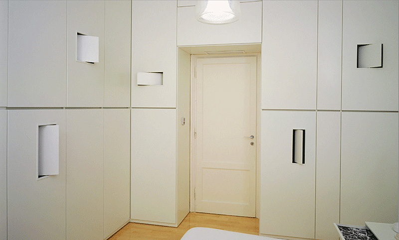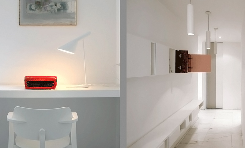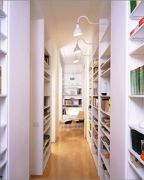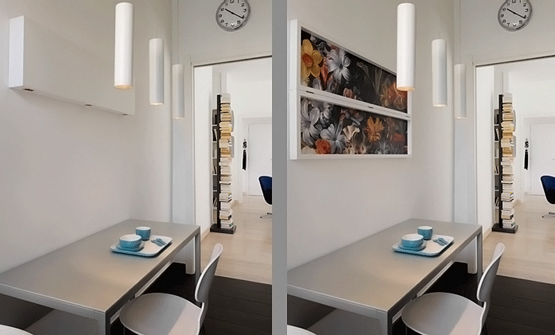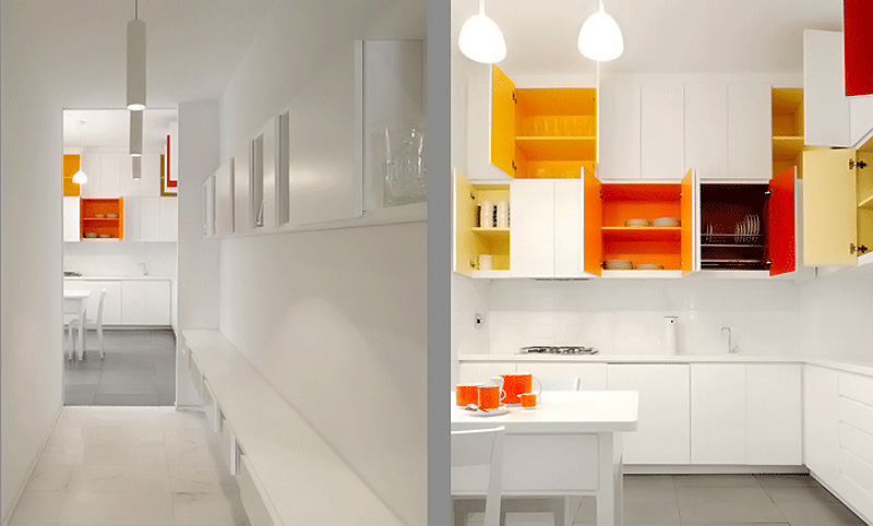 Marta Laudani and Marco Romanelli are architects from Italy whose work cannot be taken too seriously. They obviously have a thing for spaces that adapt to the owners needs and moods. One minute – a white box, the next – floral artwork. White kitchen cabinets are WAY FUNNER on the inside. And I love the map of Italy divided into multiple frames.