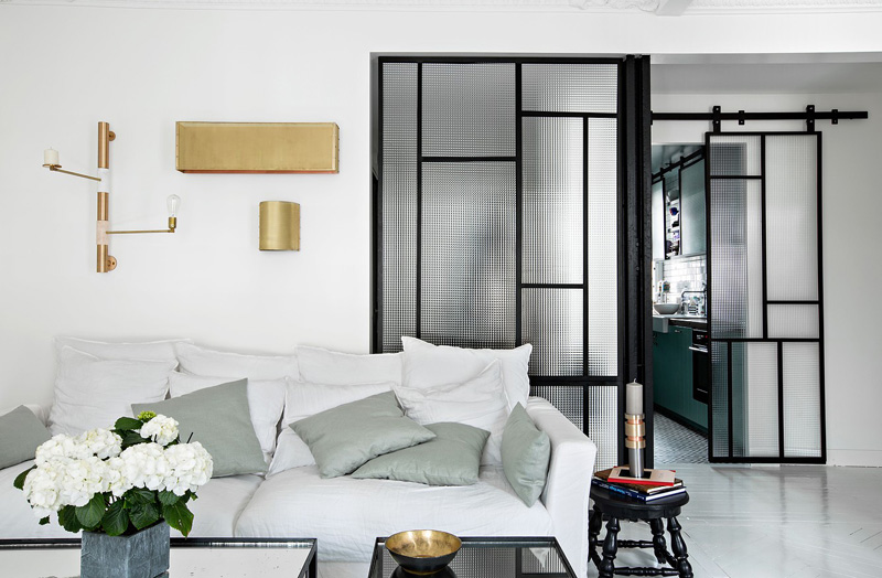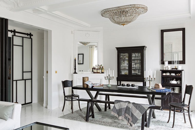 I wanted to share another project by Hauvette & Madani that I am totally in love with. I am not really a fan of the colour turquoise but OMG it works really well in this apartment. With lots of black and white to keep it grounded and modern, having the same colour scheme run throughout a small space really helps make it seem larger and keeps a nice flow going. And WHOA – check out the dining room ceiling light fixture. How divine!