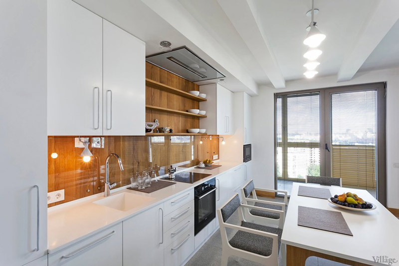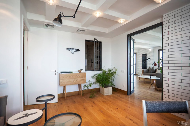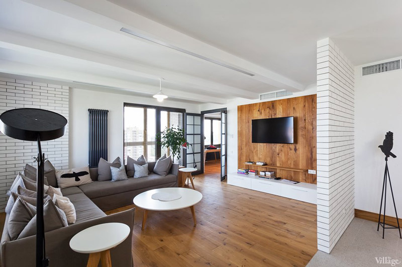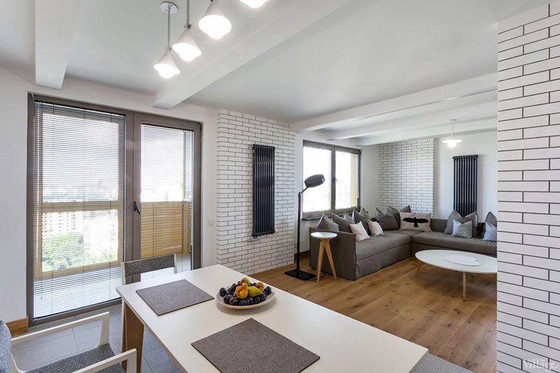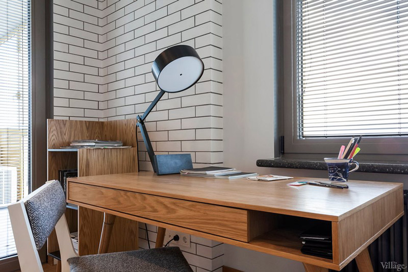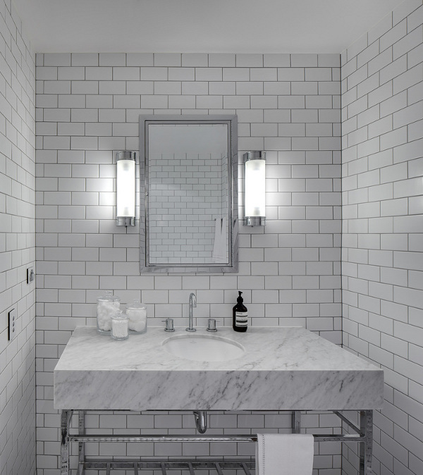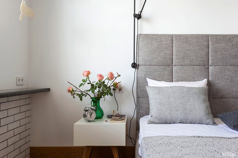 This apartment is nothing fancy and isn’t too “out there”….it’s sort of JUST RIGHT. The colour scheme is right (grey $ white with black accents is always so good), the wood flooring and accent walls are gorgeous and add some warmth, the kitchen is picture perfect, and the subway tiles/stone keep things a bit more graphic than boring drywall. Yep, I could settle in quite nicely here. Again via The Village
