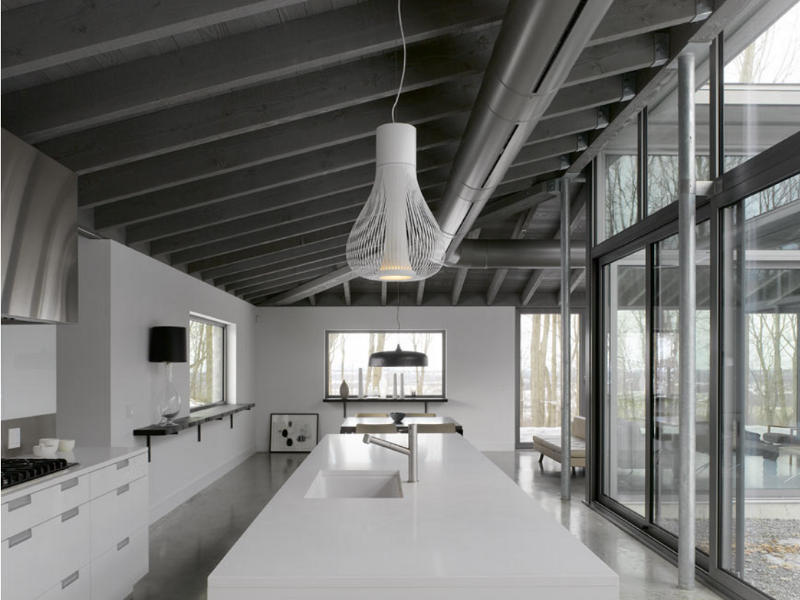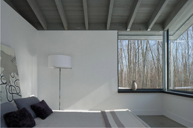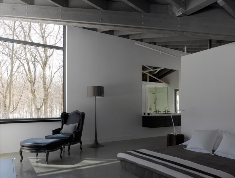 A second look at Canadian architect Paul Bernier. A departure from his timber boxes with voids and perforated floors climbing up like treehouses, this home sits solidly in a grove, its stone walls anchoring it firmly to the earth. The monotonal greys are reminiscent of Belgian interiors, clean lined and spare but with a modern, contemporary feel. As striking as this house looks in its wintery setting I cannot help imagining how different it will be when the trees are green and leafy. A cool retreat in the forest.