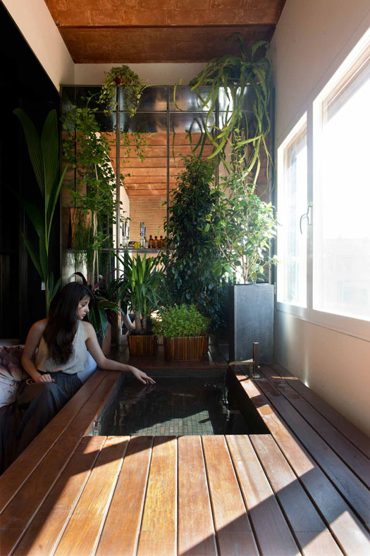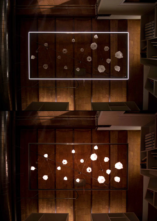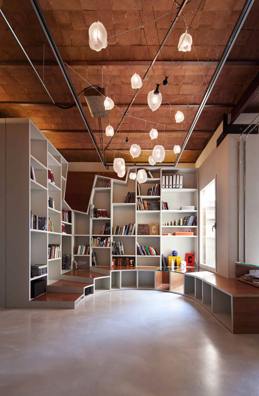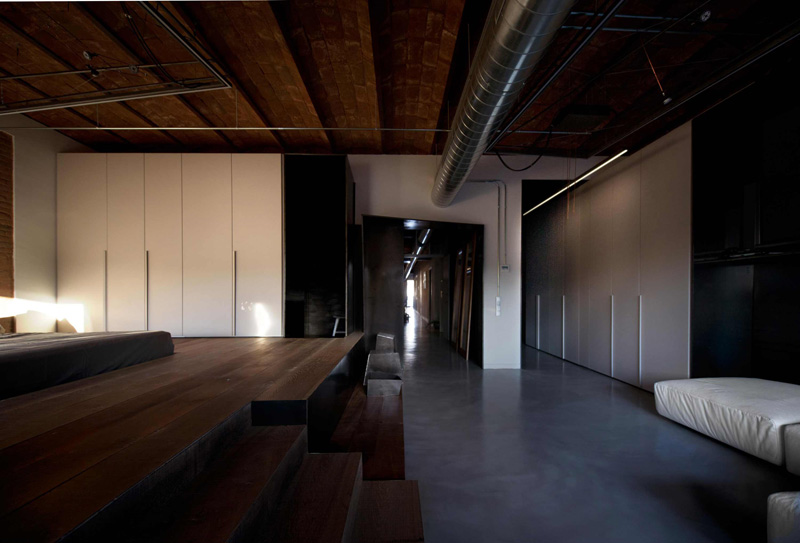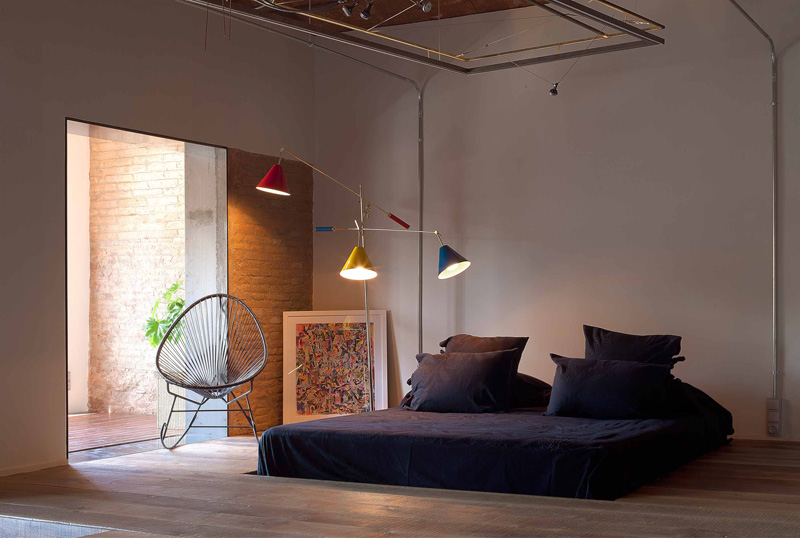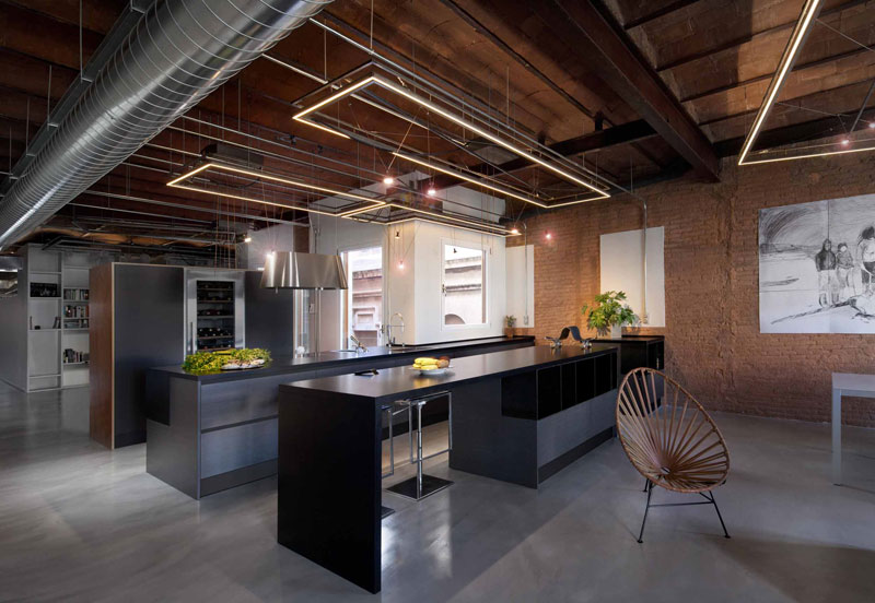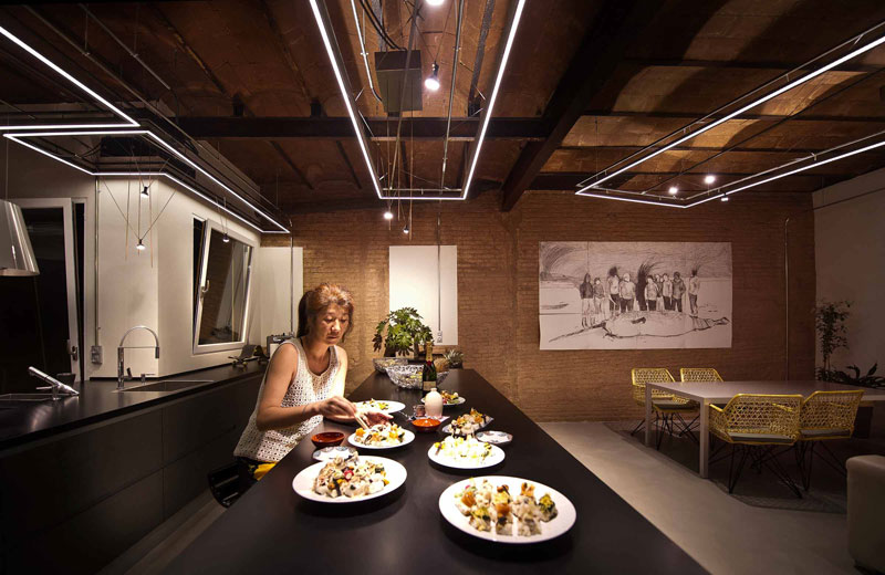 Communicating Vessels is a 250 sq.m complete apartment renovation, located in the Modernist neighborhood of Barcelona. The design layout is a response to the client’s wish for a united, open space that could benefit the natural light form early in the morning to late afternoon. For this reason, all mid-walls were demolished and the windows at the communal side façade were enlarged. The only enclosed department built from the scratch is the Core, which includes the guest room and the service areas, leaving the rest of the space diaphanous. Every use is ‘marked’ by a Lighting Carpet, a customized and highly resolved lighting system. As the floor carpets do, the Lighting Carpets, ‘warm up’ a specific territory of this home while the same time, indicate the use, by their distinct positioning and size. This loft space is HOT. I love the concept of using lighting to delineate a space – much more creative than throwing down some area rugs.