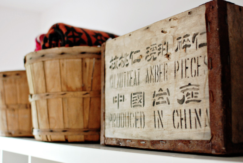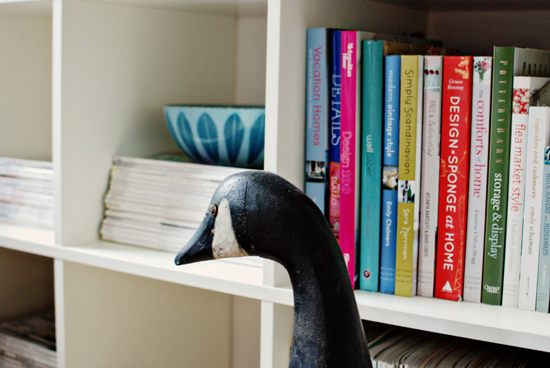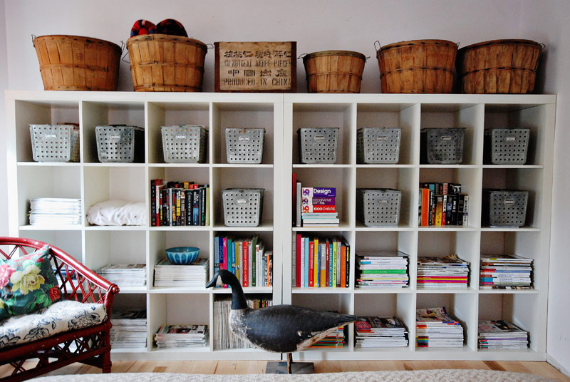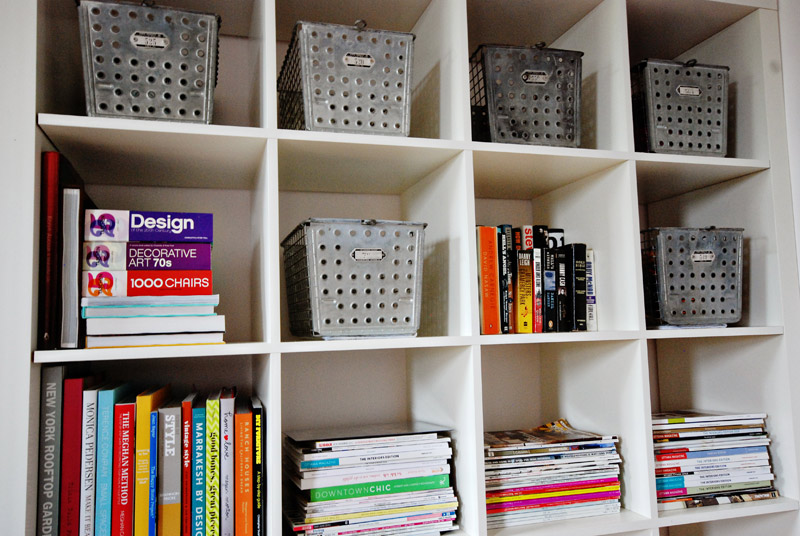 I have been on holidays these past 2 weeks and dear gawd did I need this break (at least from one of my jobs). Since Tuesday I’ve been pretty much stuck at home during the day which I welcomed, because it meant getting lots of things done I have been putting off – including several tasks involving organzing something or other. Yesterday, after walking to the post office to pick up some hot boots, it was time to organize the bookshelves in my bedroom. I really don’t like having all this book storage in my bedroom (to me it’s like bad feng shui – too much visual stimulation for a room that’s supposed to give me tranquility), but it was the only free wall in my tiny house that could house my magazine collection and some books. I threw some of the older magazines out because holy smokes I have far too many, and made the piles neat again. Once the contents were organized (and shrunk down a bit) I went out to the storage shed and dug out some apple baskets and a couple wooden crates I had purchased some time ago at an antique shop out in the boonies. I am a FREAK for rustic/industrial storage options, and these, along with my vintage metal locker baskets, helped in the wrangling of my crap. I’m a happy camper now, and I think I can sleep a little better tonight knowing it’s not a disaster. (P.S. Before the hubby moved in, the shelves looked like this, and after when I de-feminized the space, the room looked more like this).