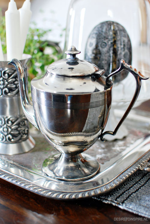 Also in the kitchen, I’ve got a new centrepiece on my dining table thanks to a bunch of goodies from Highjinx (a local non-profit thrift shop where proceeds help the homeless). For about $40 I scored some really cool silver items (that I added to some I already had). I dug out a silver tray from the basement that my grandmother had given me and voilà, new bling on my table.