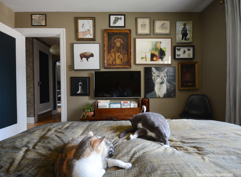 I finally caved and agreed to have a TV in the bedroom. A wise decision. It is so cozy watching movies in bed. Because it is rather large and ugly I did what I usually do and surrounded it with art to hide it. Above the door is a vintage map of Ottawa embroidered with a heart by Sadie & June from Maker House Co.. Deer and raven prints by ButterBean Design. Buffalo print by 100th Meridian from Maker House Co. Vintage saint painting from Antiquus Goods. Skull and ribcage drawings from Cassie Meder. ‘Mr. Wolf’ original mixed media by Dulce Tapp from Orange Art Gallery. Vintage mounted butterflies from a flea market. Horse photo by Road Trip Creative. Original oil painting I had commissioned for husband of our dearly departed Cheeks. And last but not least, ‘Animal’ by Marc Adornato.