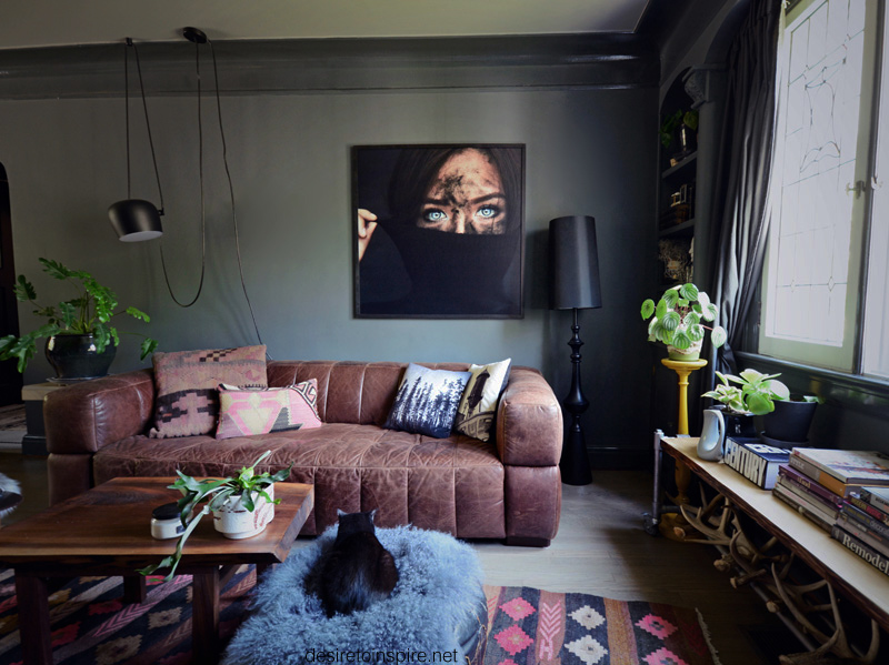 (The hanging light is the Aim pendant by the Bouroullec brothers for Flos, the kilim pillow is from the Third World Bazaar, the ferals have scratched the crap out of my leather sofa and we have yet to purchase and install trim since our floors were refinished because the projects in this house are never-ending so don’t look too closely)
