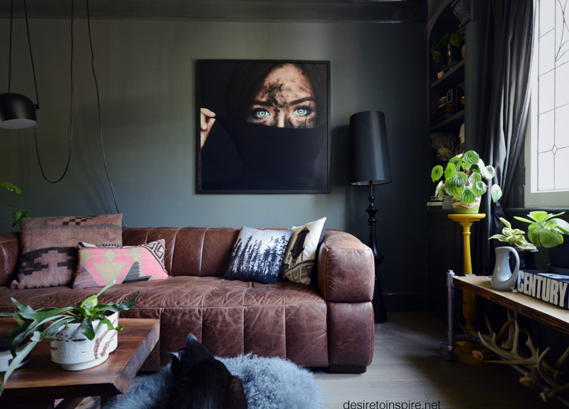 (Cowhide is from eBay, the faux fur stool is from Homesense, the leather and wood chair is from Green Light District, the Jieldé lamp I bought off a DTI follower, and the clay vase is by le lou ula, walls are painted Downpipe by Farrow & Ball)