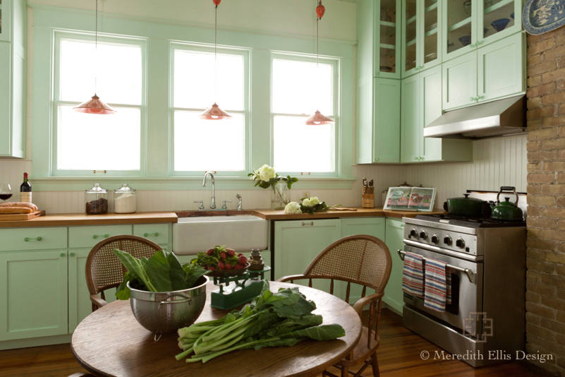 How many types of mint can you name? Peppermint, spearmint,Vietnamese mint, apple mint, lemon mint, pineapple mint, catmint and… kitchen mint. A lovely, fresh take on a kitchen colour palette by Austin, Texas based Meredith Ellis Design.