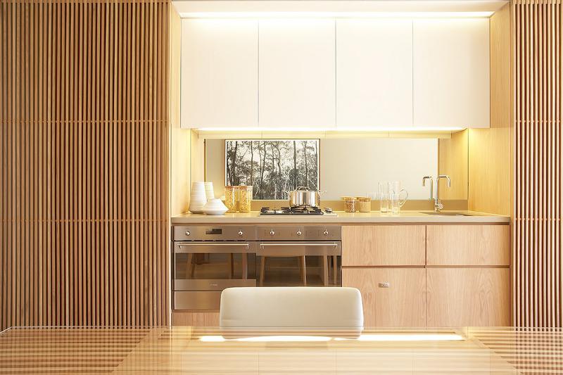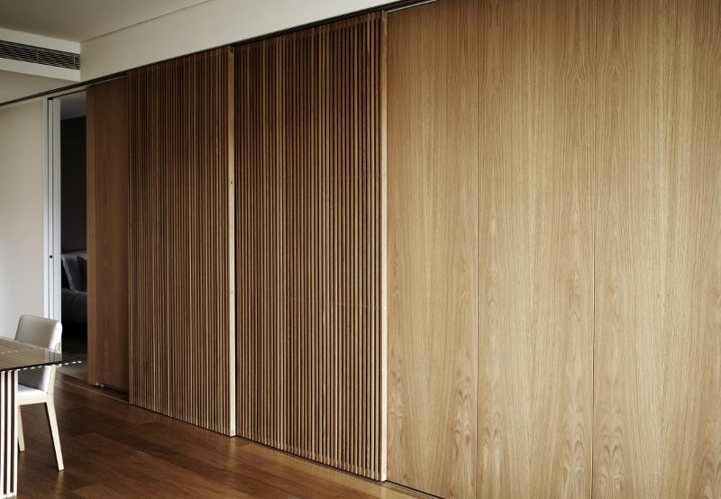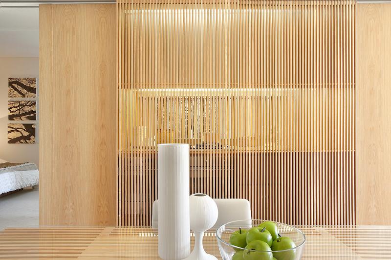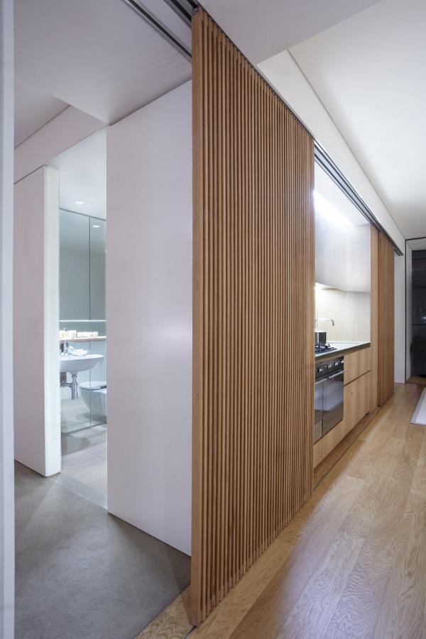 How clever… and stylish! Sliding timber screens of solid and perforated slats open up spaces or conceal the kitchen from the living area in this small apartment by Sydney-based Koichi Takada Architects.