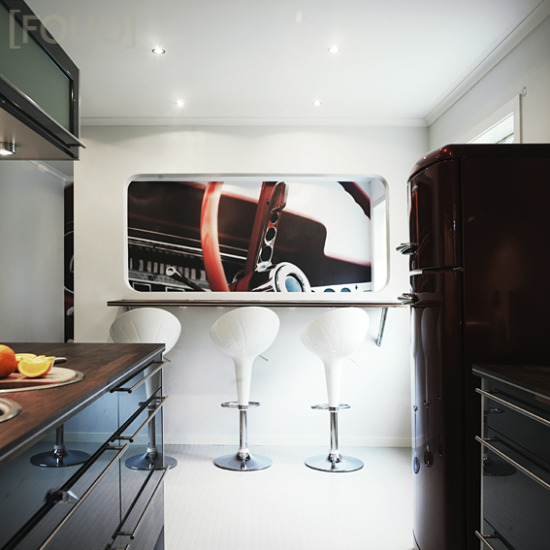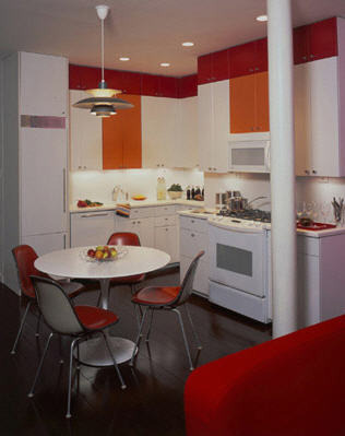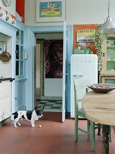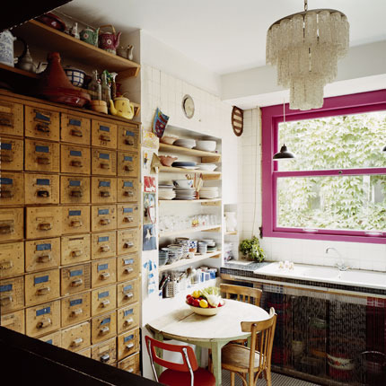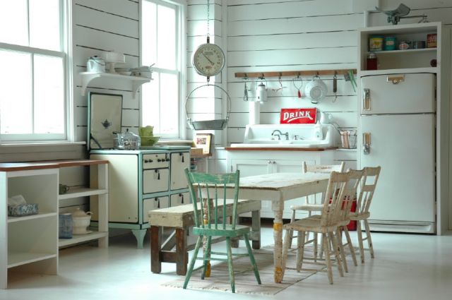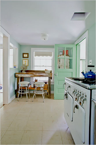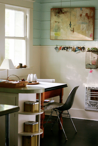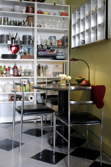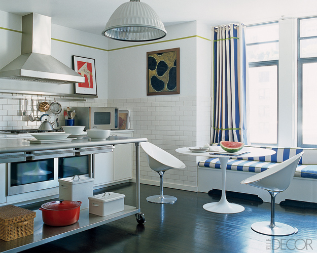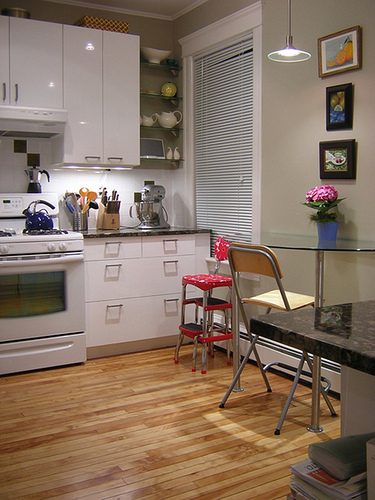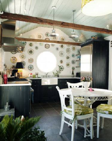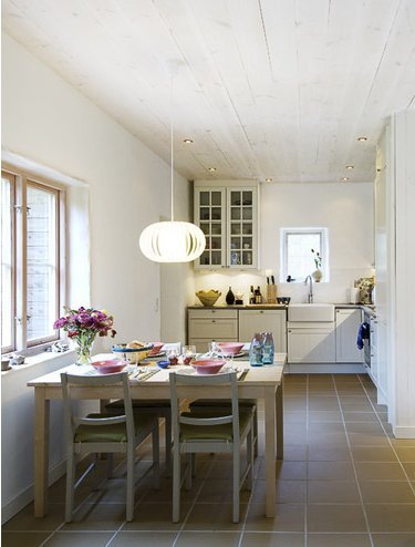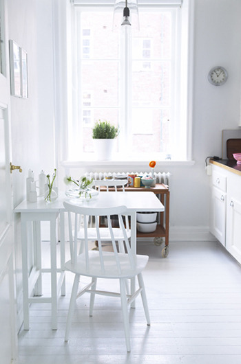 Stacy emailed us recently asking for some inspiration for her sis: “We live in a very expensive “city” in the US, full of retirees, so the only affordable houses are either falling apart or brand new cookie cutter subdivision types. My sister and her husband are in the process of buying a new house and have chosen the new option. The kitchen, of course, consists of an L shape…counters, cooktop, fridge, sink, dishwasher etc with no island or even room for one. I was wondering if you have a collection of rooms where the eating table is inside the kitchen? I would like to show her how she can make it look less boring in there.” Hopefully the following photos of small-ish kitchens with mini dining areas will help Stacy’s sister spice up her blah kitchen.