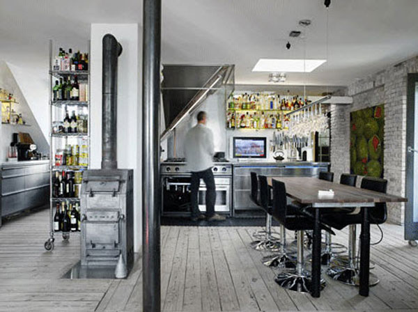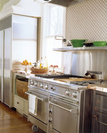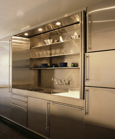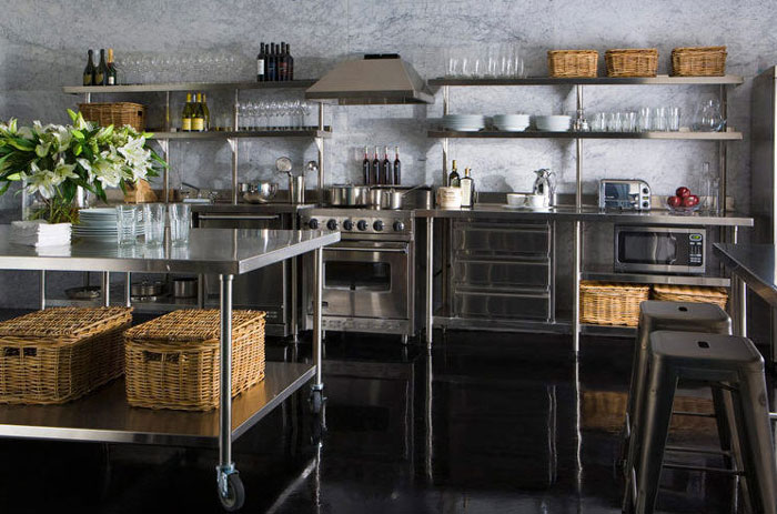 I unfortunately don’t have an arsenal of photos that showcase stainless kitchens with open shelving but I did manage to find a few, and then some without the open shelving that I thought were pretty cool. Hope these help Joanne!