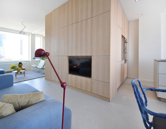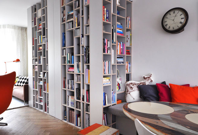 The library rules. No not “ssshhh no talking”. I mean this amazing library rules! The house too. The book lined shelves provide transition between the old house and the new extension, screening the open plan living areas from the hallway and front door. Black, white and wood, my favourite combo, are accentuated by the polished concrete floor and occasional burst of colour. By Melbourne based design atelier Techné.