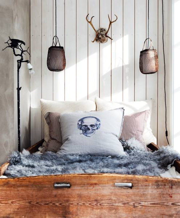 And speaking of lighting, I’m still smitten with bare bulb light fixtures, and hanging them in this set-up is really creative. Especially when highlighting objects directly below.