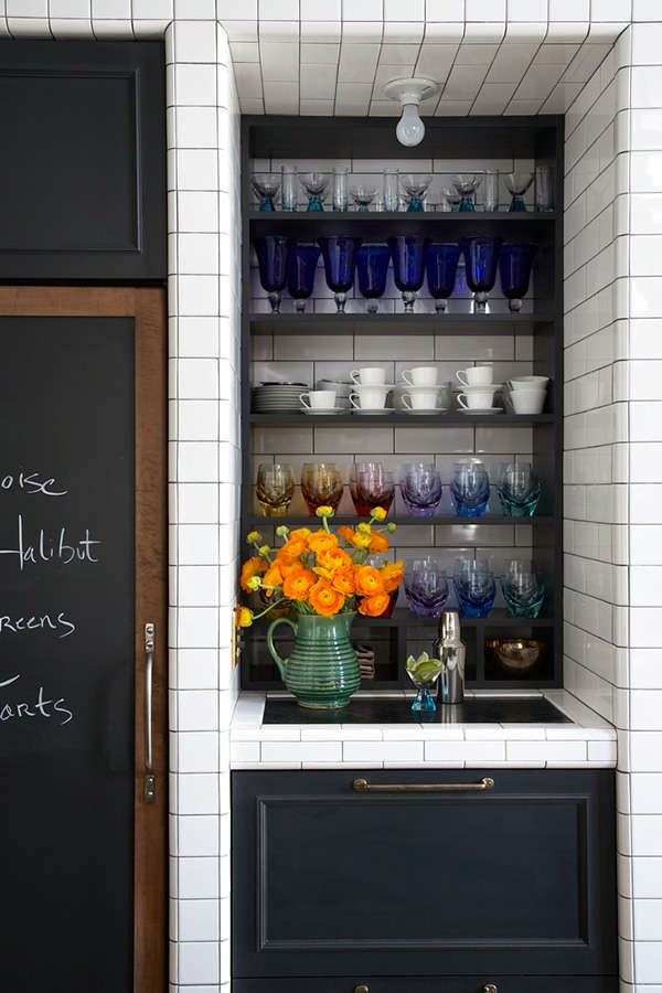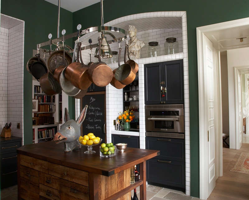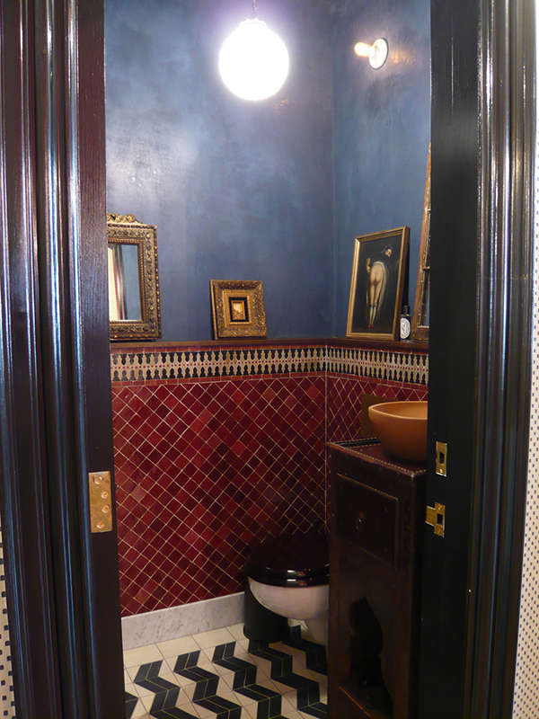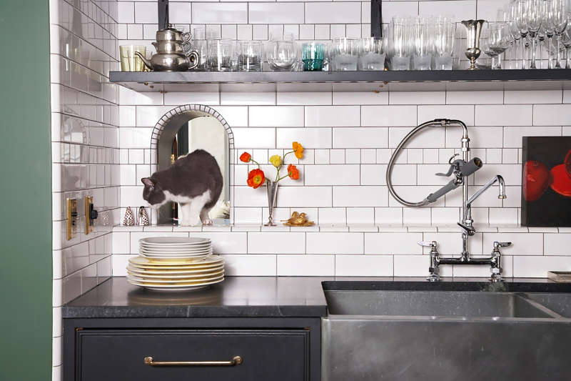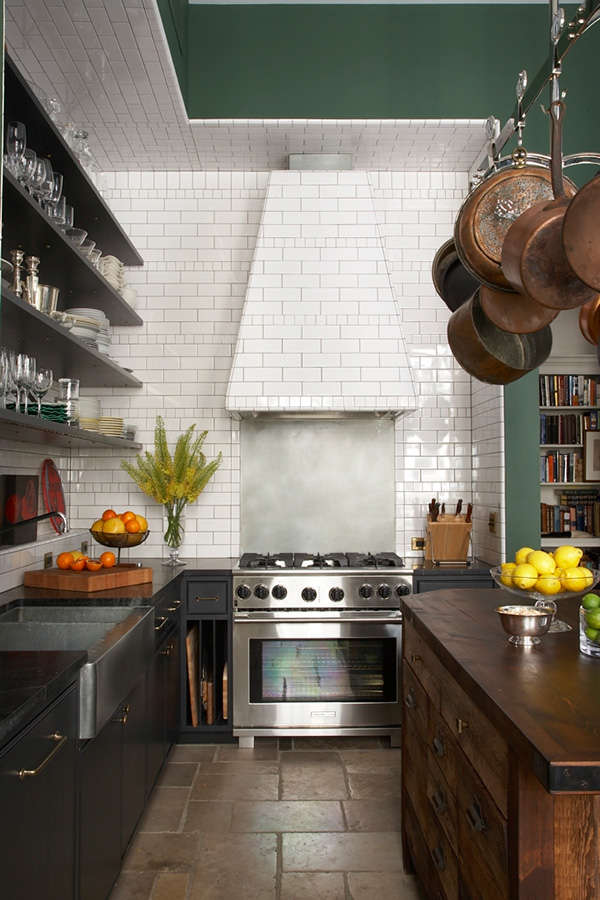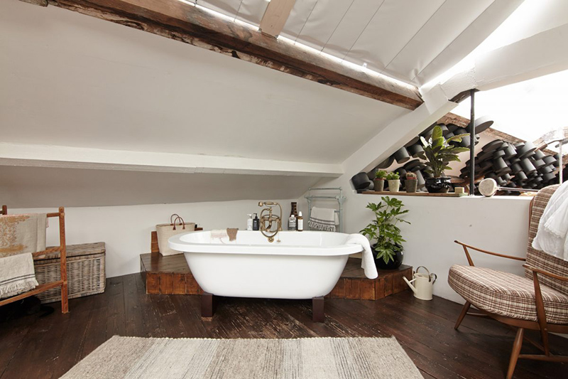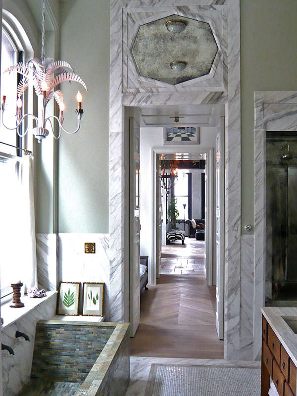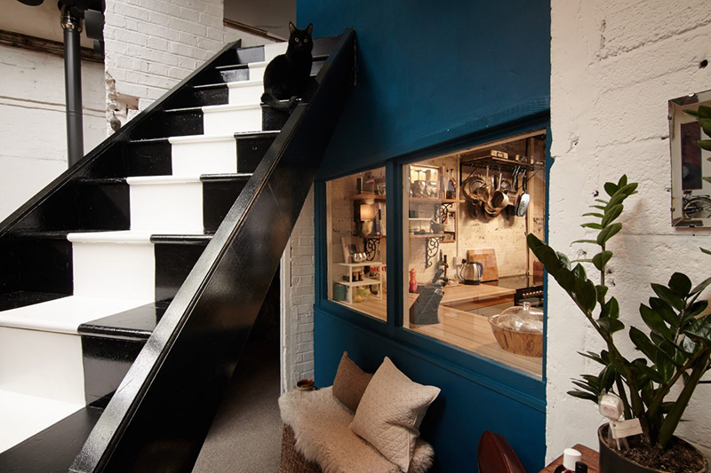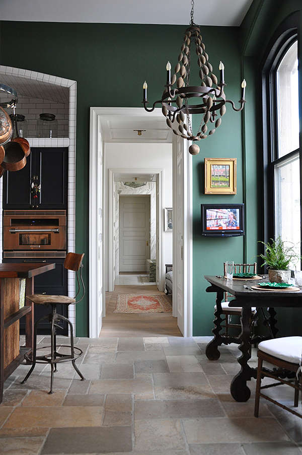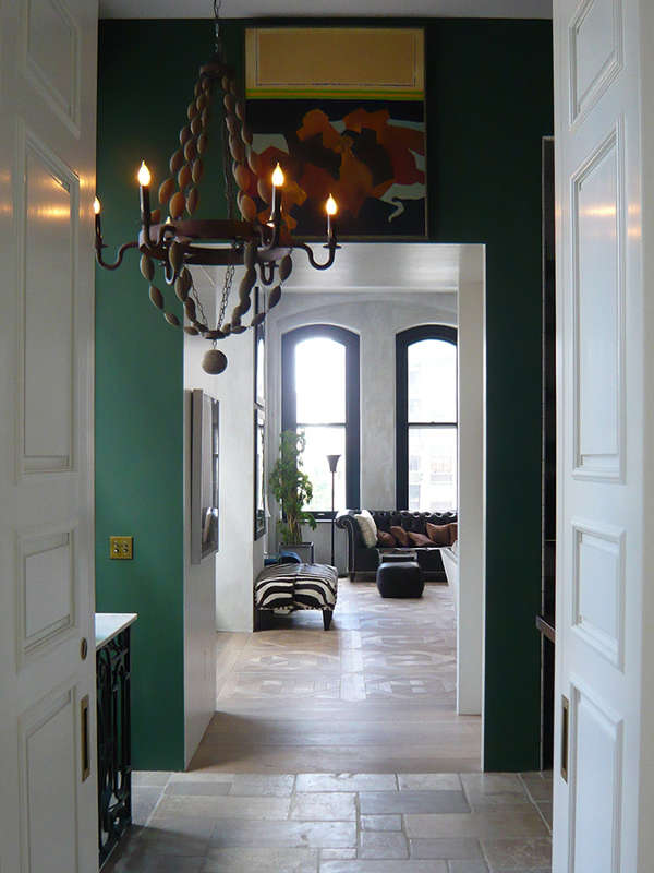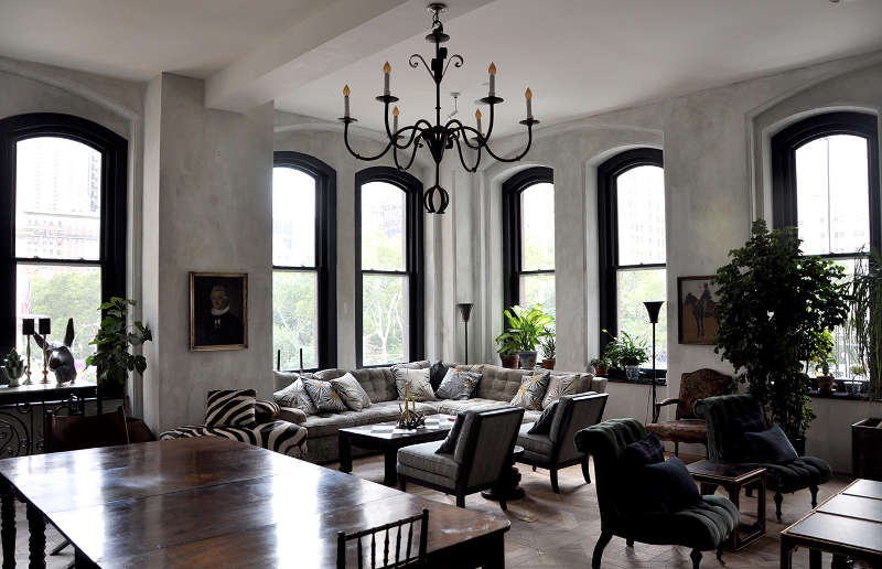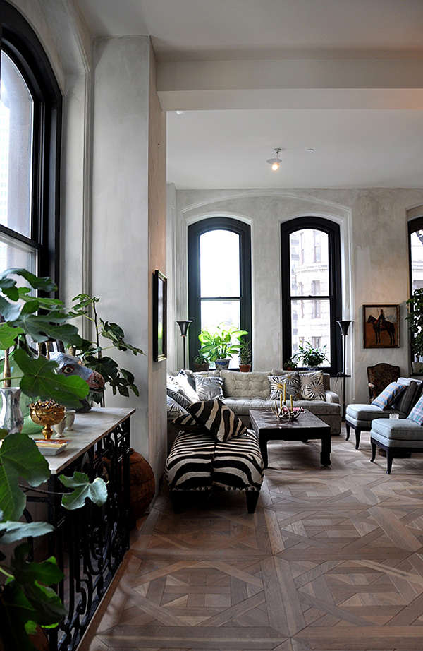 At first I was drawn by the large windows. Then I realised they had be picked out in black paint to contrast with the grey walls only to have it dawn on me that it was grey plaster beautifully polished on those walls. Momentarily distracted by the black chandelier hanging from the ceiling my gaze settled on the wood floors. Speaking of floors did you see the floor tiles? Tiles? OMG the powder room and that kitchen and the archway with the cat. Stop it! That bathroom is outrageous. Flatiron loft by Frances Mildred.