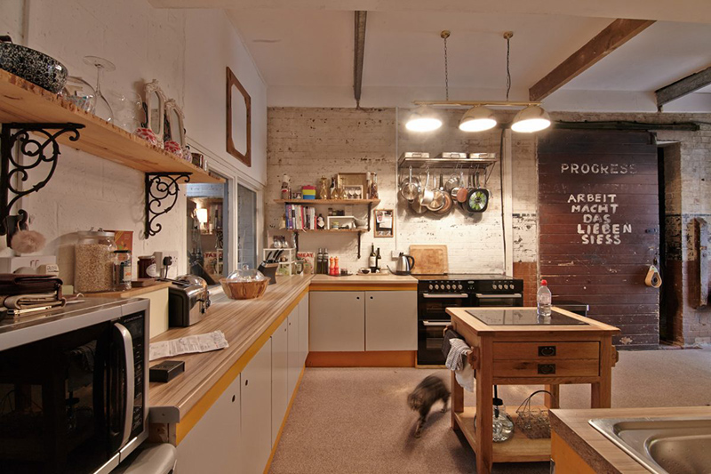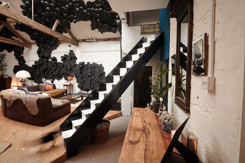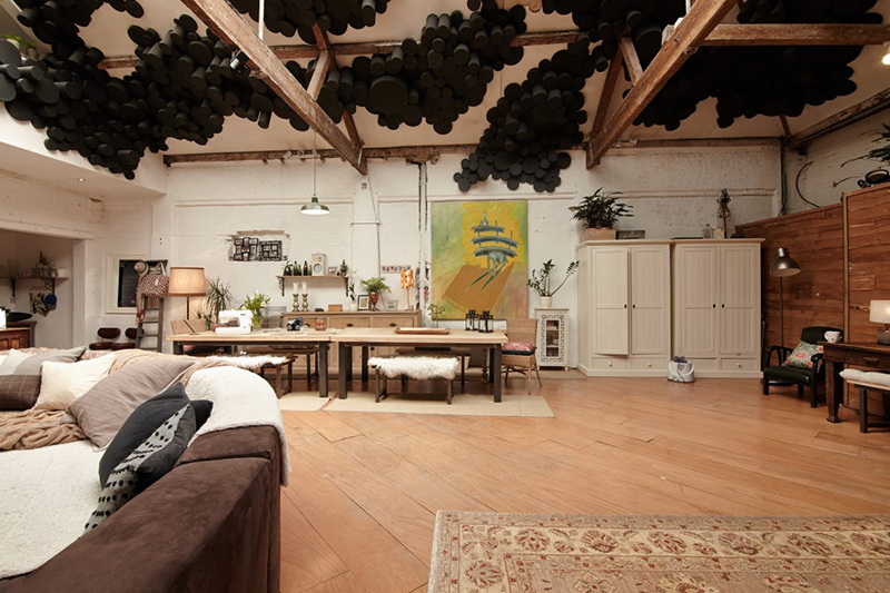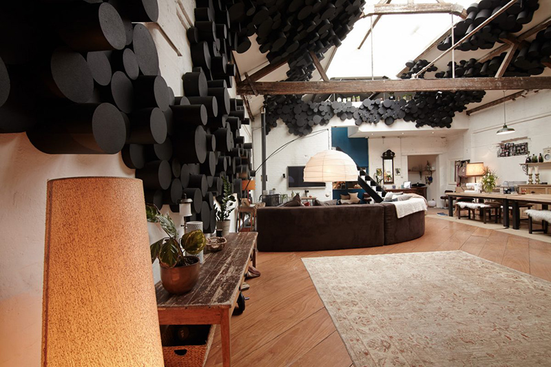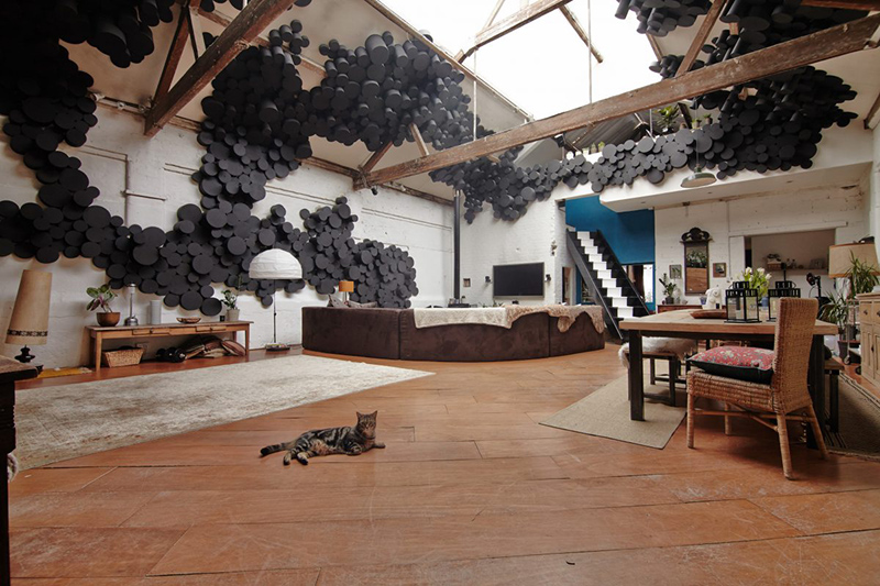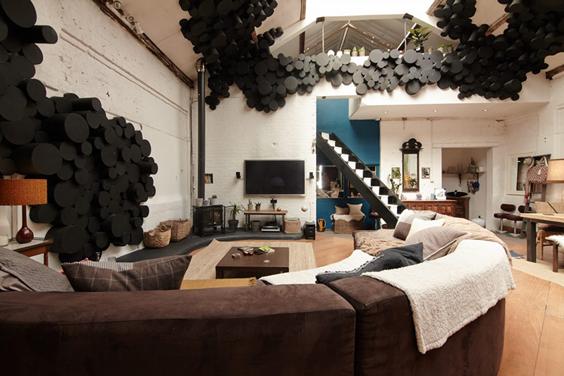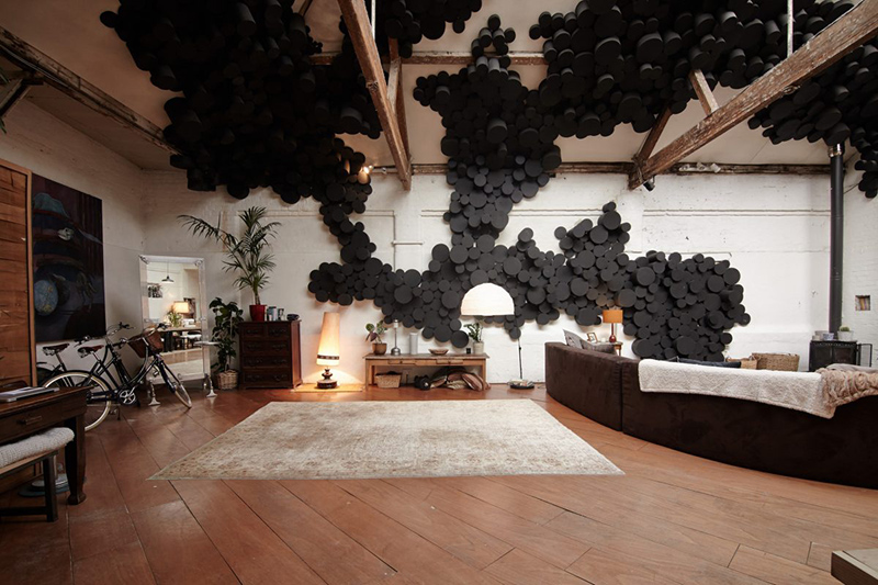 I wanted to share this awesome warehouse conversion in London that has a bit of a twist. Someone clearly had a lot of time on their hands….and a lot of foam. The foam clouds likely help with the acoustics in the space, so it works double duty. I think it’s a pretty cool art installment, and I would totally live with it no problem if I could have this loft. That much space, with up to 30′ ceiling heights, and my cats would have a blast tearing around and trying to climb the foam. Available as a location property through Shoot Factory.
