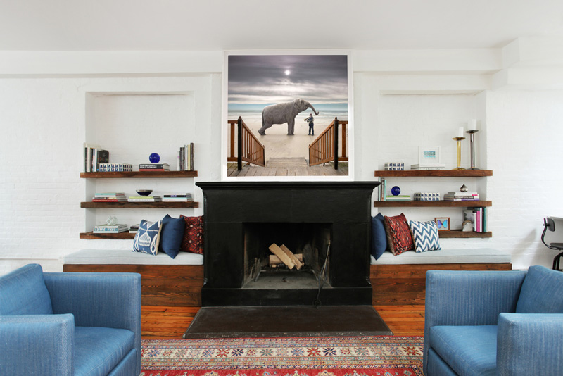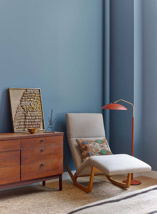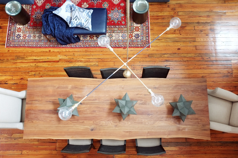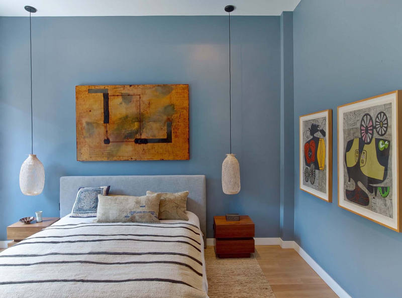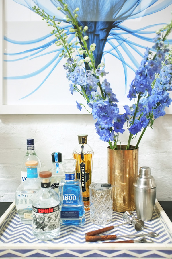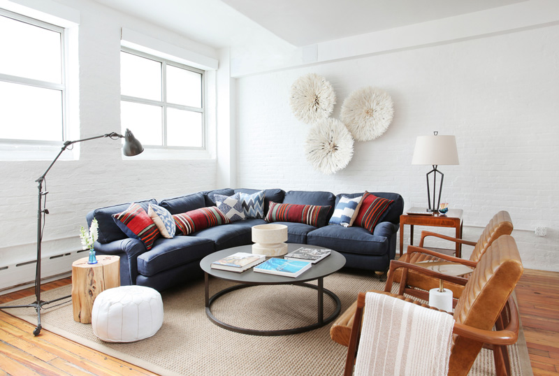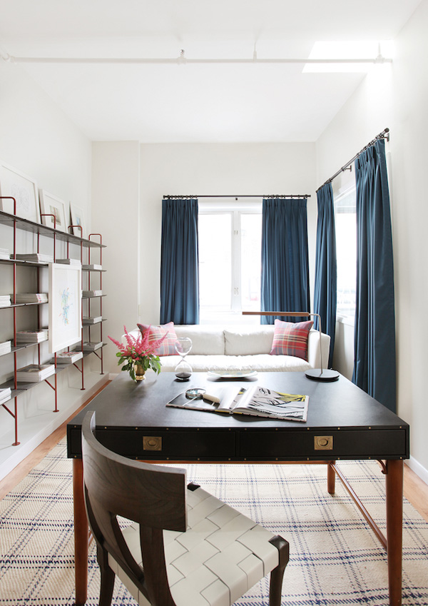 From a bit feminine in my last post, to a bit masculine with this space. This SoHo loft designed by J+G Design is stylish and functional with blue accents added throughout. I can imagine the male homeowner waiting for Jennifer and Georgie to leave after having these photos taken, then immediately tossing in the trash all those flowers and branches and wondering why in the hell there are 8 pillows on the damn sofa. 😉